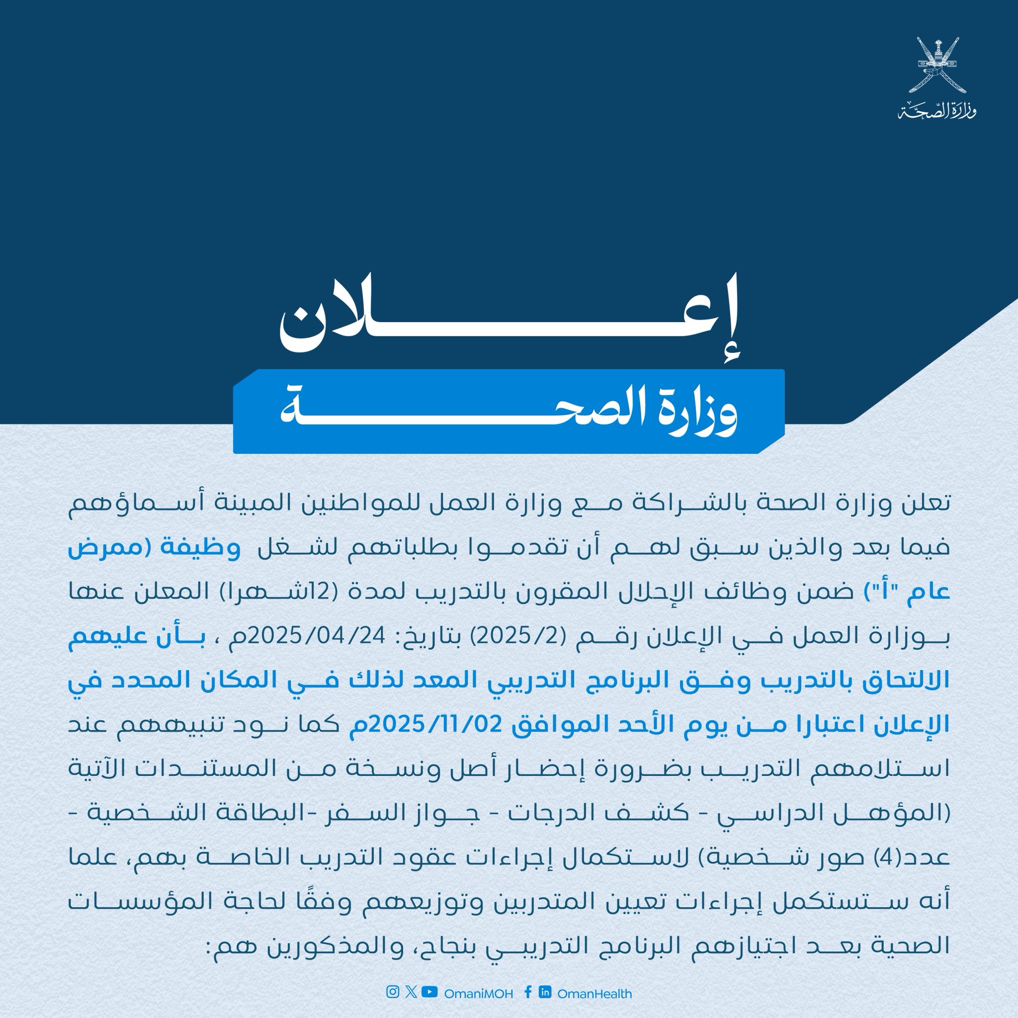 وزارة الصحة - أسماء مواطنين الذين تقدموا لشغل وظيفة (ممرض عام "أ")، بأن عليهم الالتحاق بالتدريب في المكان المحدد بالإعلان