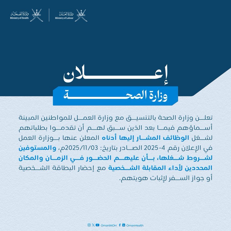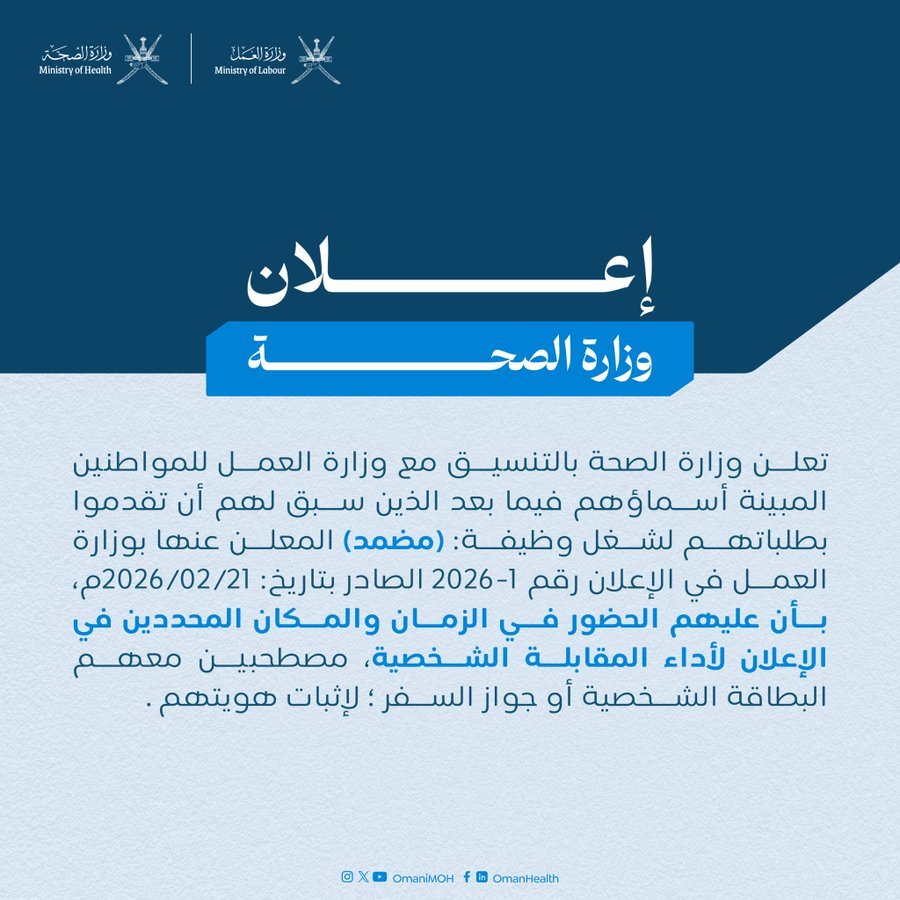 وزارة الصحة – أسماء المترشحين لأداء المقابلة الشخصية لشغل وظيفة (مضمد) بمستشفيات ظفار والبريمي والسويق