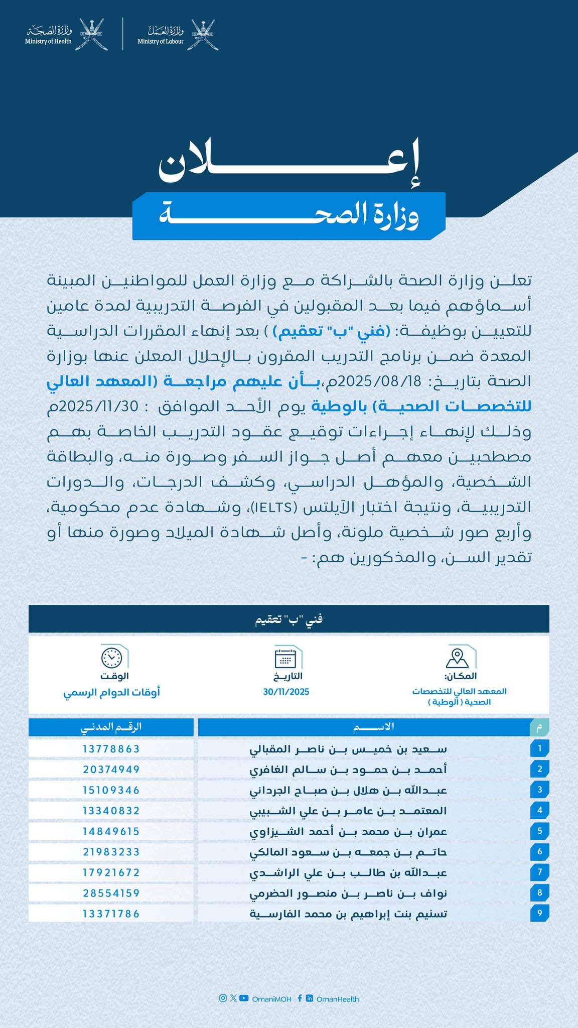 وزارة الصحة - تُعلن للمواطنين المبينة أسماؤهم فيما بعد، الذين تقدموا لشغل بعض الوظائف الطبية المساعدة، بأن عليهم الحضور في الزمان والمكان المحددين لإنهاء إجراءات تعيينهم