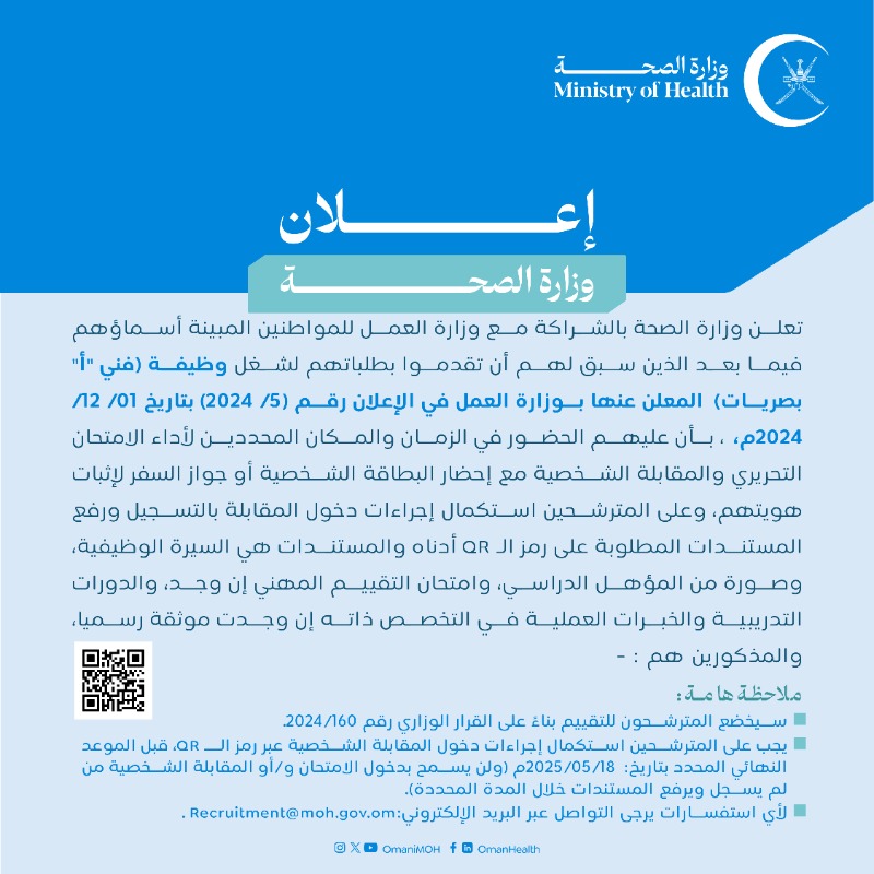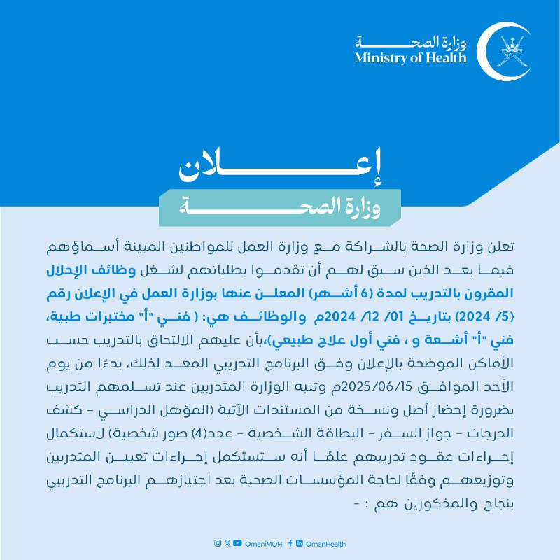 وزارة الصحة - أسماء مواطنين للالتحاق بالتدريب لشغل وظائف ( فني "أ" مختبرات طبية، فني "أ" أشعة و ، فني أول علاج طبيعي)