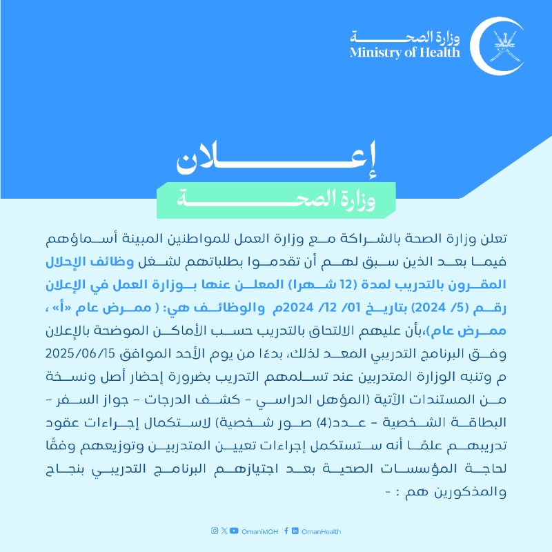 وزارة الصحة - أسماء مواطنين للالتحاق بالبرنامج التدريبي لشغل وظيفة (ممرض عام أ - ممرض عام)