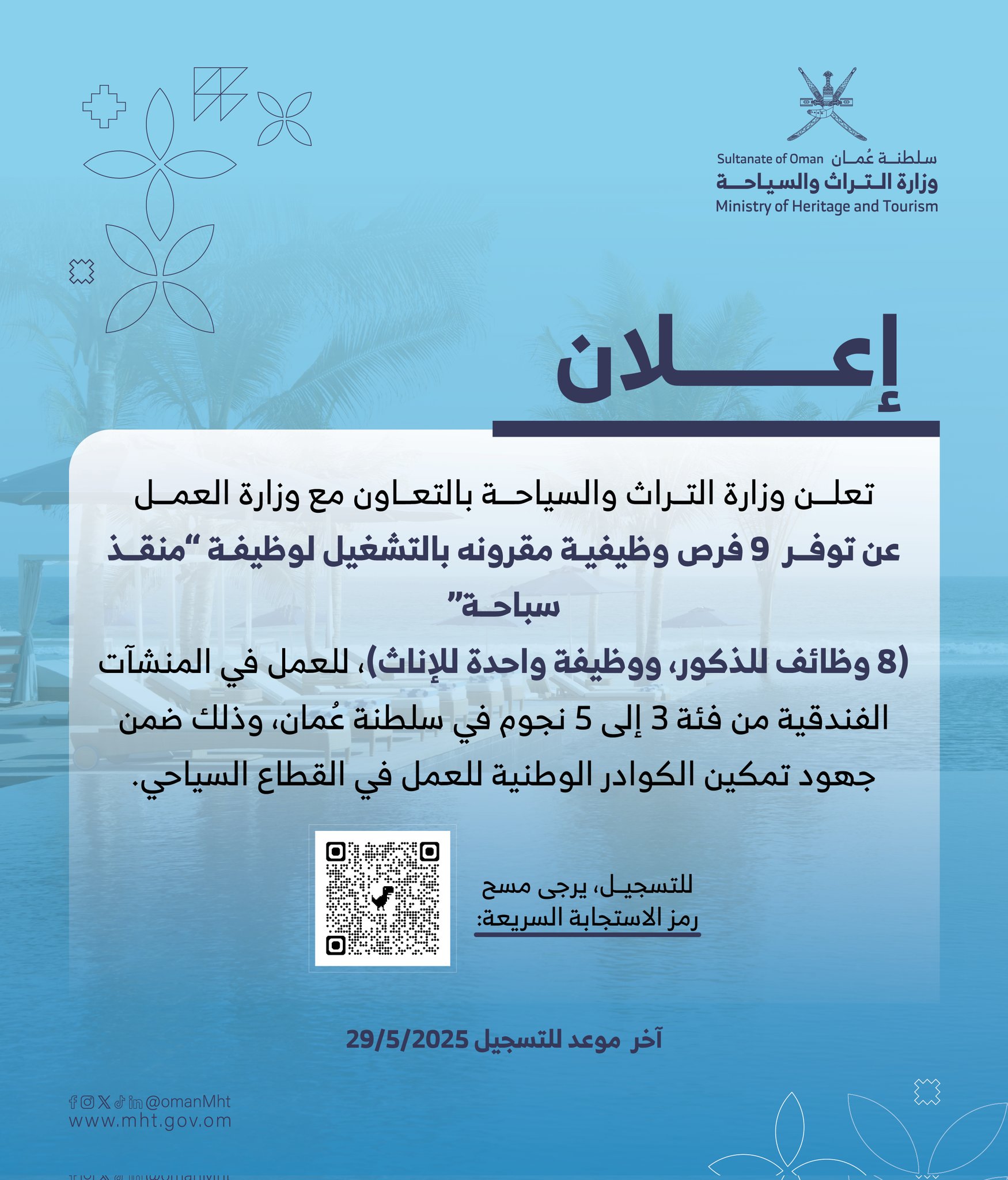 وزارة التراث والسياحة - توفر 9 فرص وظيفية مقرونه بالتشغيل لوظيفة "منقذ سباحة"