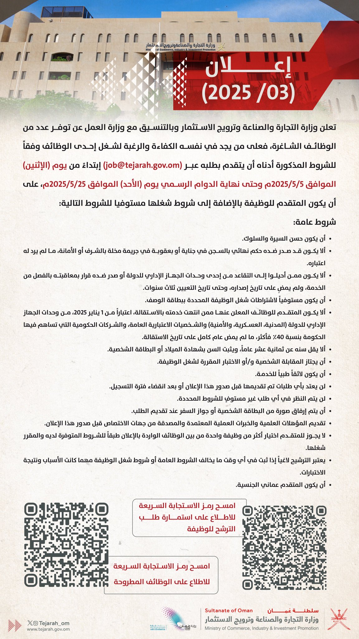 وزارة التجارة والصناعة و ترويج الاستثمار - 3 وظائف شاغرة بعقد مؤقت