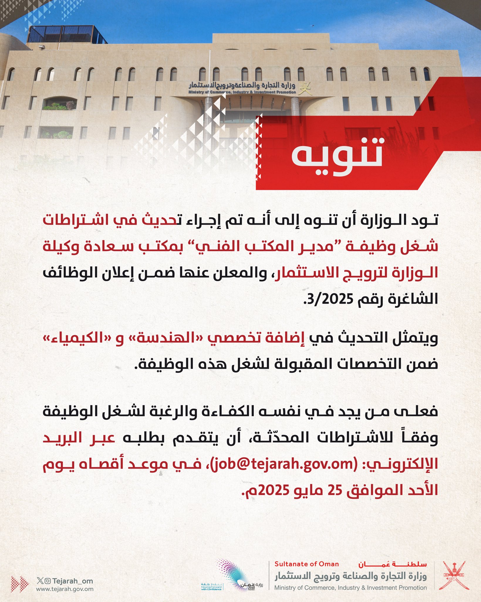 وزارة التجارة والصناعة وترويج الاستثمار - تنويه بتحديث في اشتراطات شغل وظيفة "مدير المكتب الفني"