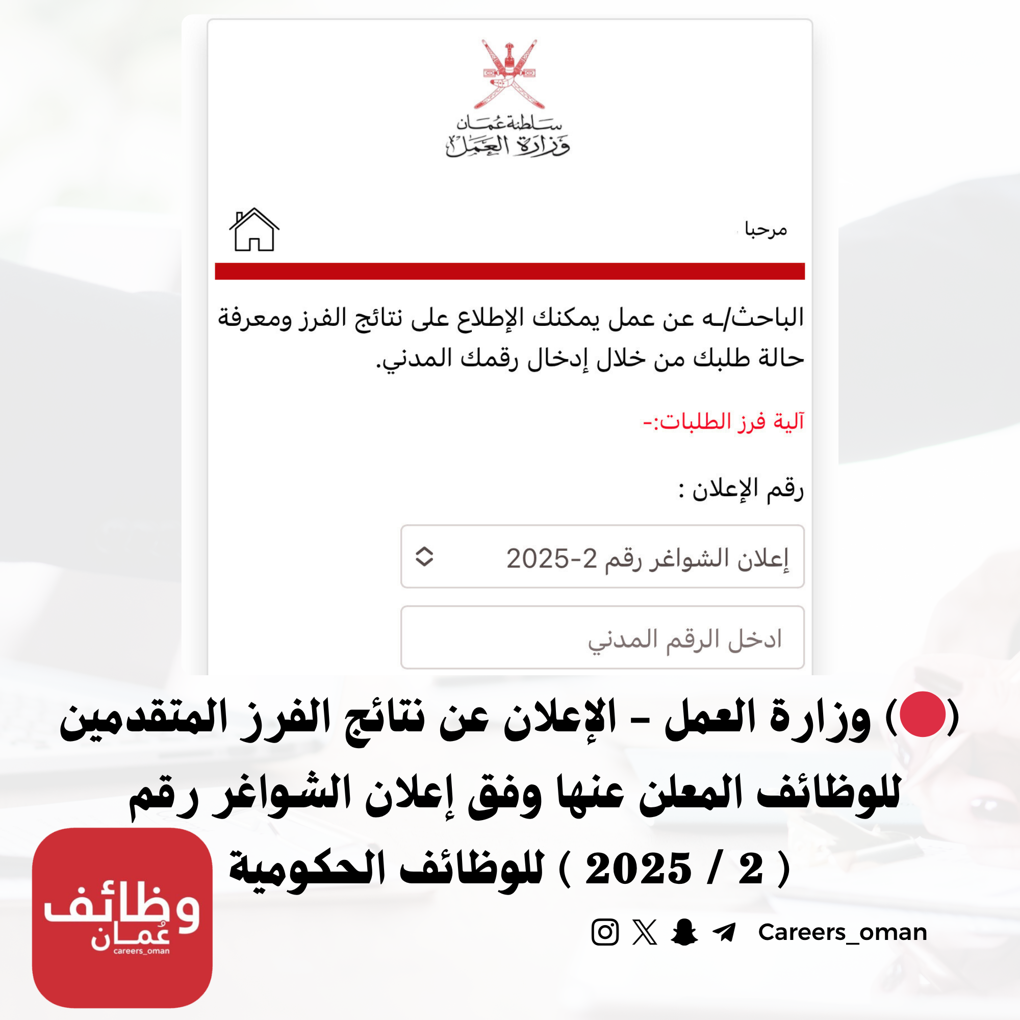 وزارة العمل - الإعلان عن نتائج الفرز المتقدمين للوظائف المعلن عنها وفق إعلان الشواغر رقم ( 2 / 2025 ) للوظائف الحكومية