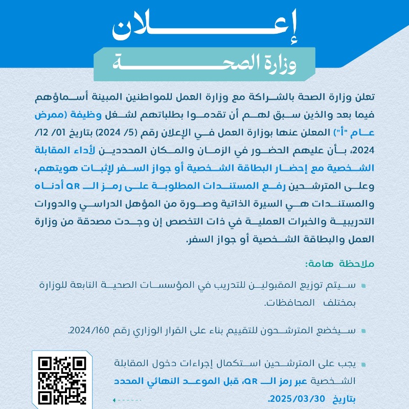 وزارة الصحة - أسماء مواطنين لإجراء المقابلة الشخصية لشغل وظيفة (ممرض عام أ )