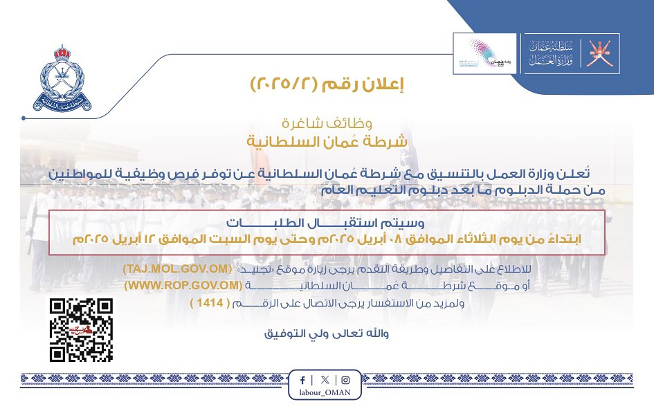 شرطة عمان السلطانية - وظائف شاغرة للمواطنين من حملة الدبلوم ما بعد دبلوم التعليم العام