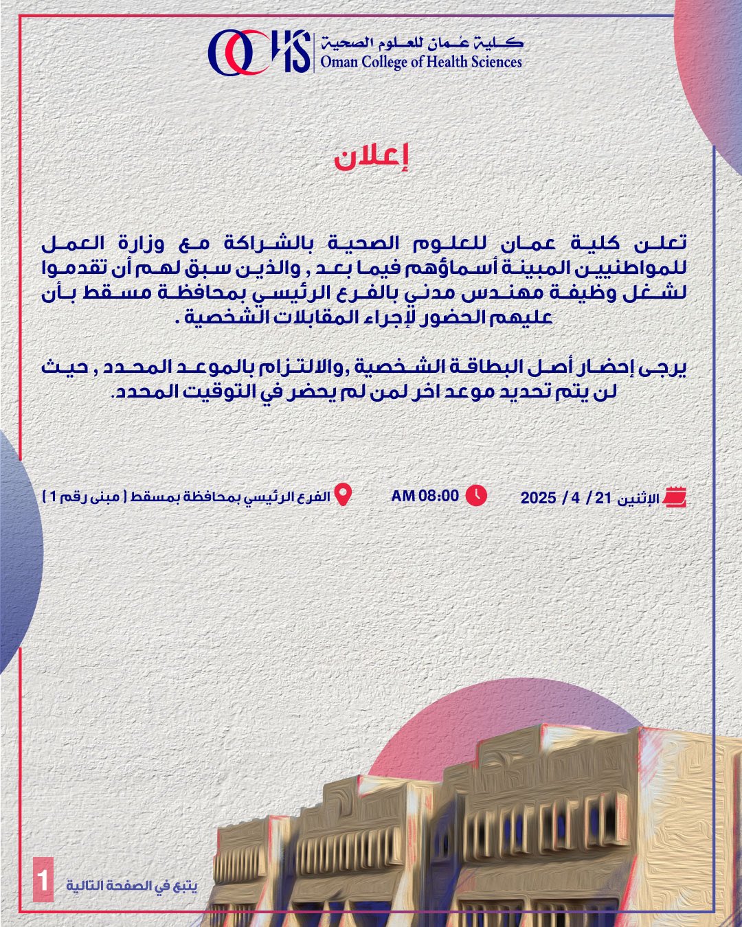 كلية عمان للعلوم الصحية - اسماء مواطنين لإجراء المقابلات الشخصية لوظيفة مهندس مدني