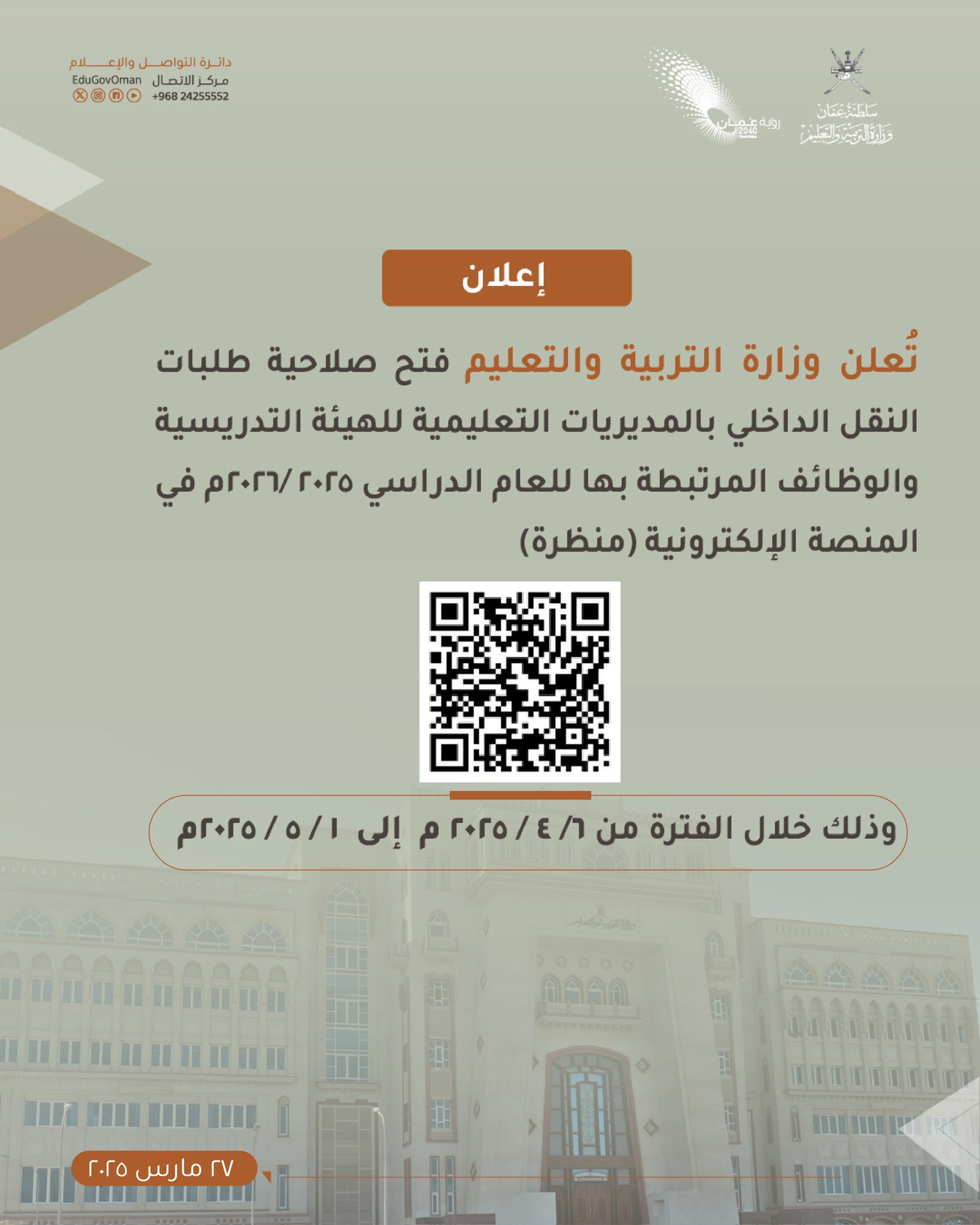 وزارة التربية والتعليم - فتح صلاحية طلبات النقل الداخلي بالمديريات التعليمية للهيئة التدريسية والوظائف المرتبطة