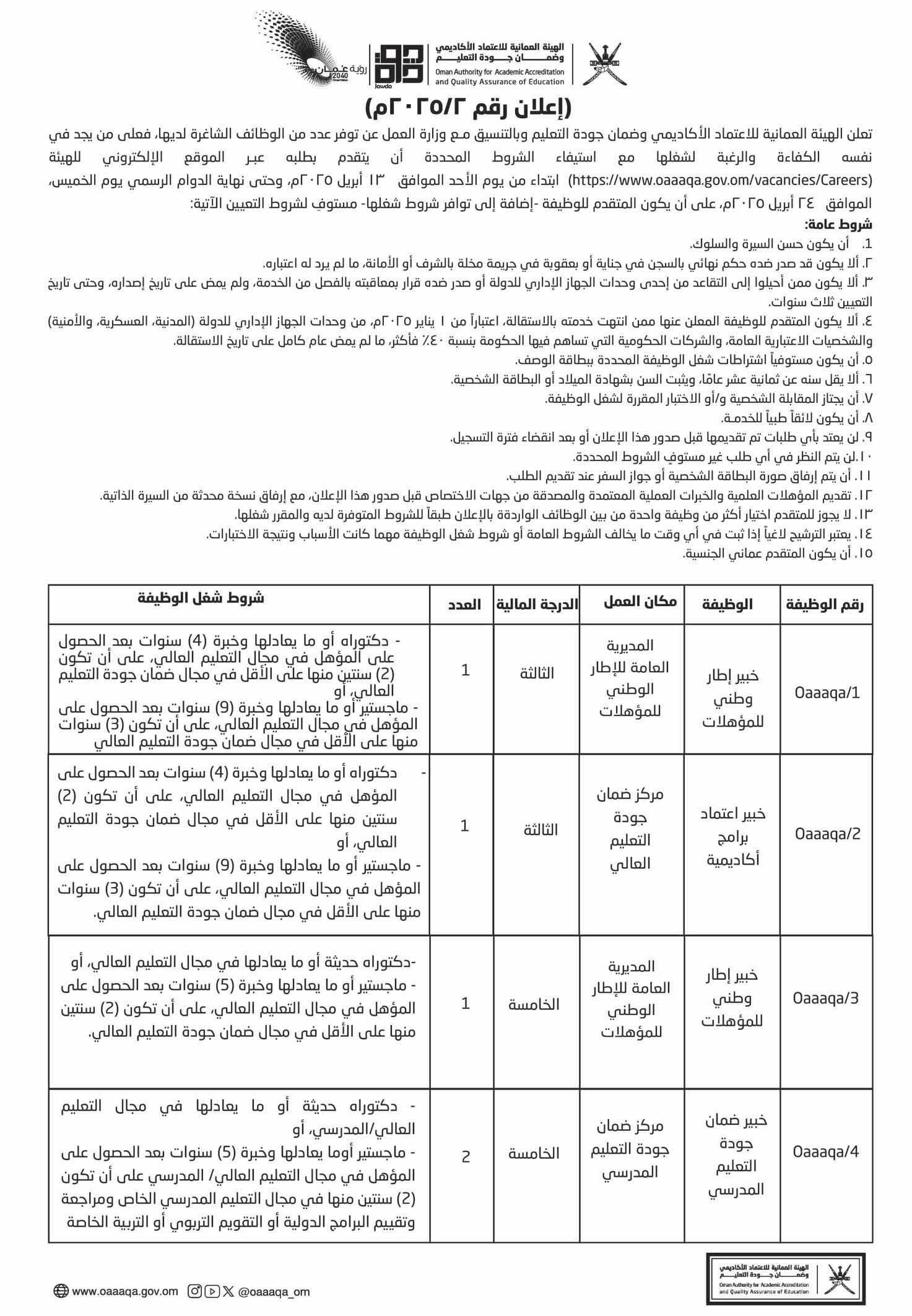 الهيئة العمانية للاعتماد الأكاديمي وضمان جودة التعليم - وظائف شاغرة