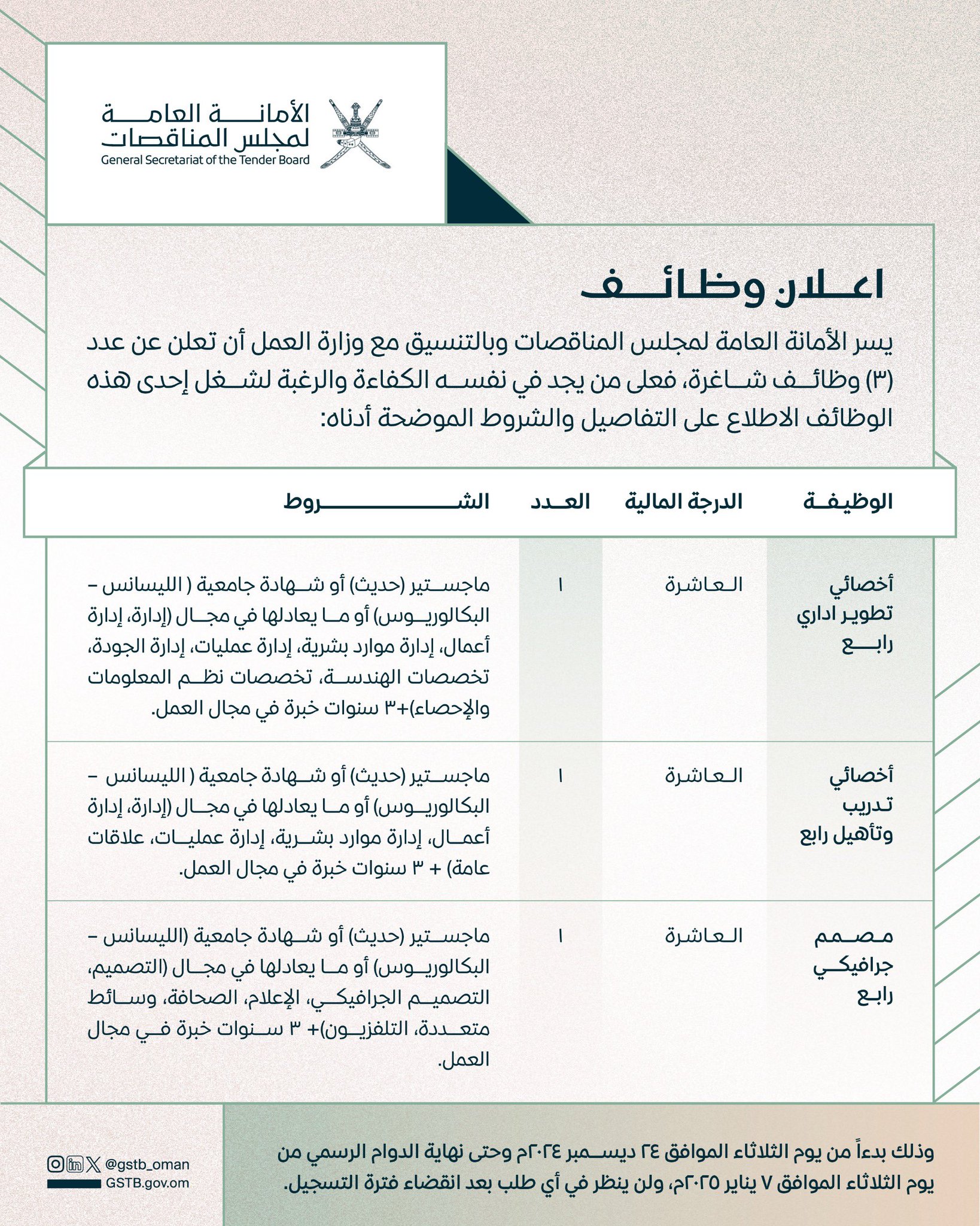 الأمانة العامة لمجلس المناقصات وبالتنسيق مع وزارة العمل - توفر 3 وظائف شاغرة