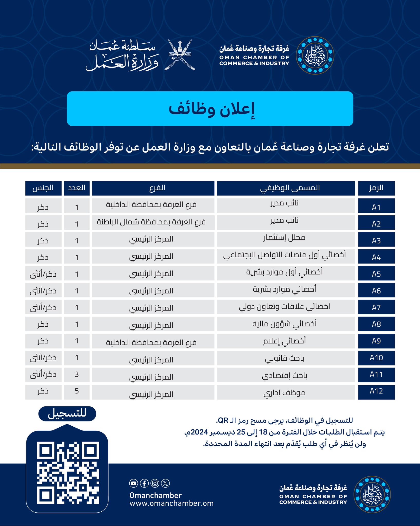 غرفة تجارة وصناعة عُمان بالتعاون مع وزارة العمل - الإعلان عن توفر 18 وظيفة شاغرة