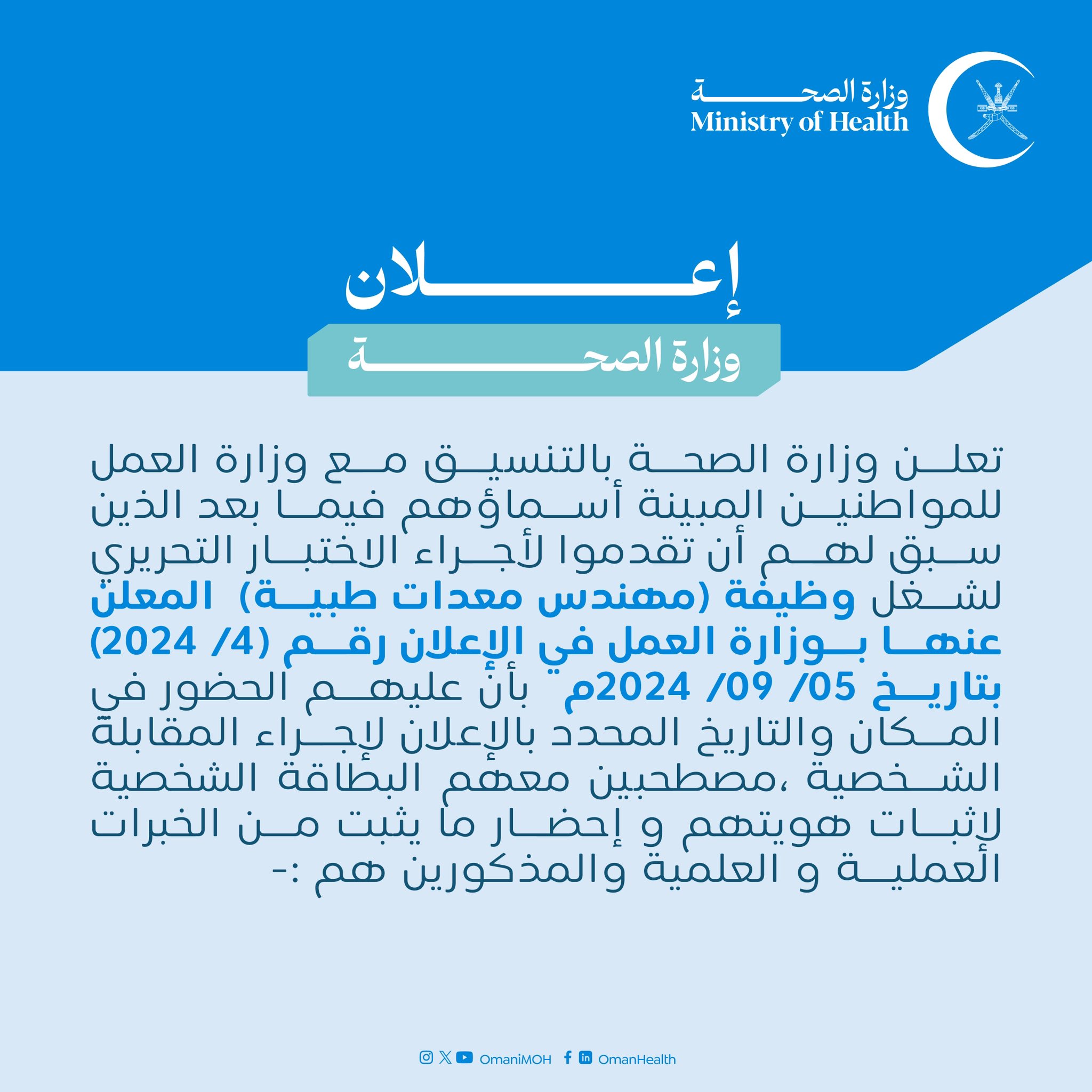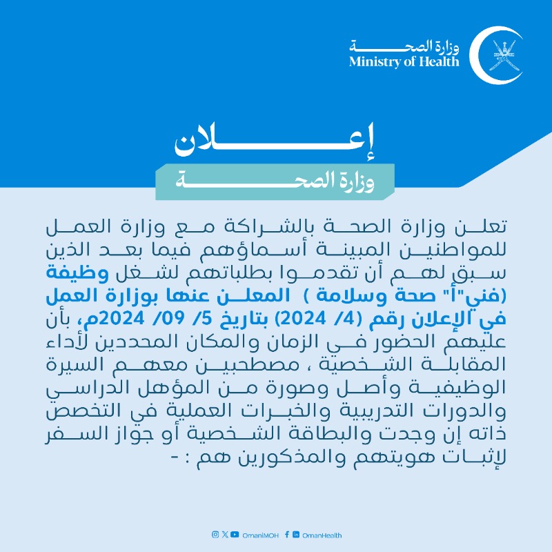وزارة الصحة بالتنسيق مع وزارة العمل - تنبيه المواطنين المتقدمين للتنافس على الشواغر الوظيفية المعلن عنها بالإعلان رقم (5/ 2024) الصادر من وزارة العمل بتعديل شرط اجتياز معايير التقييم والمقابلة الشخصية