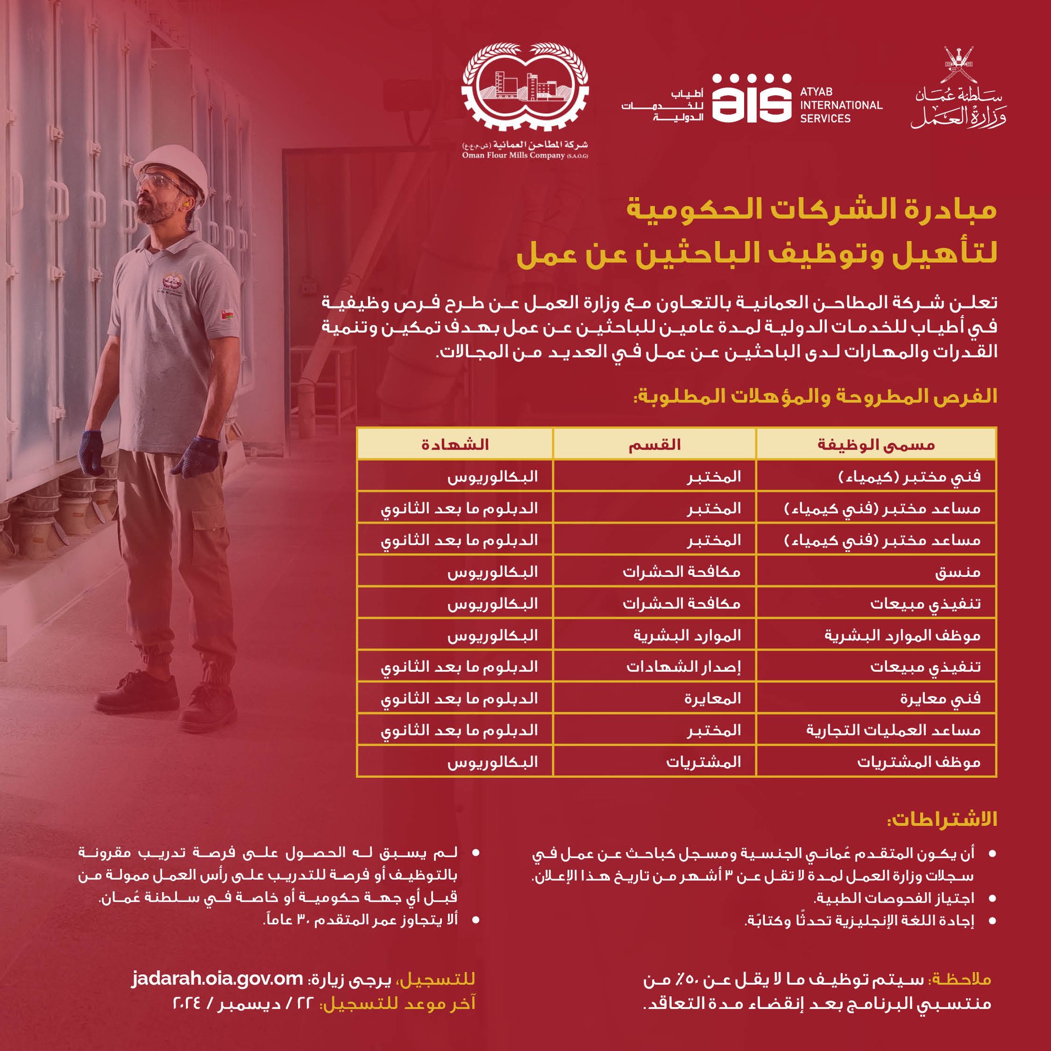 شركة المطاحن العمانية بالتعاون مع وزارة العمل - طرح 10 فرص وظيفية