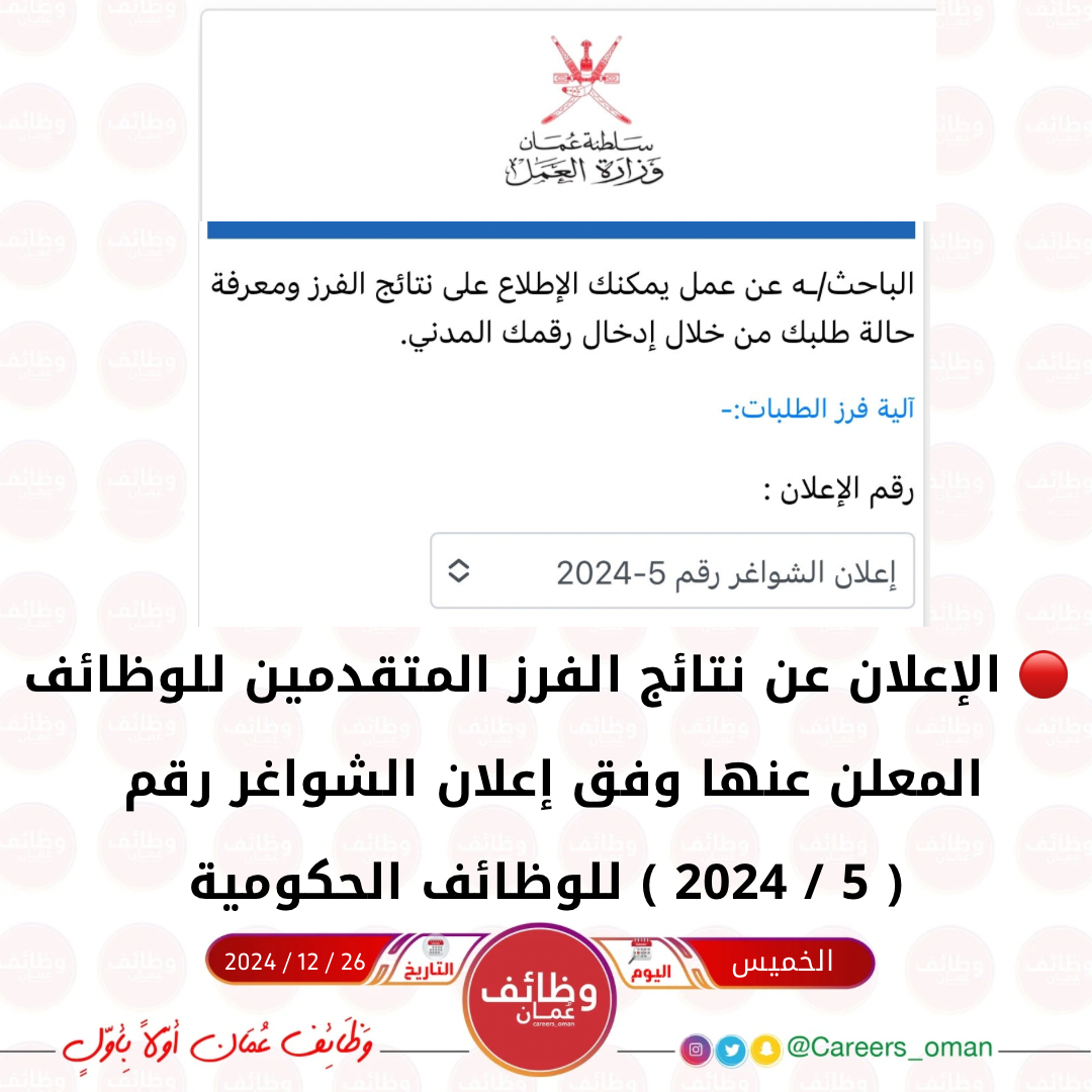 الإعلان عن نتائج الفرز المتقدمين للوظائف المعلن عنها وفق إعلان الشواغر رقم ( 5 / 2024 ) للوظائف الحكومية