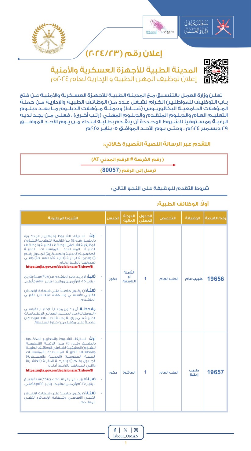 وزارة العمل بالتنسيق مع المدينة الطبية للأجهزة العسكرية والأمنية - فتح باب التوظيف لشغل عدد من الوظائف الطبية والإدارية