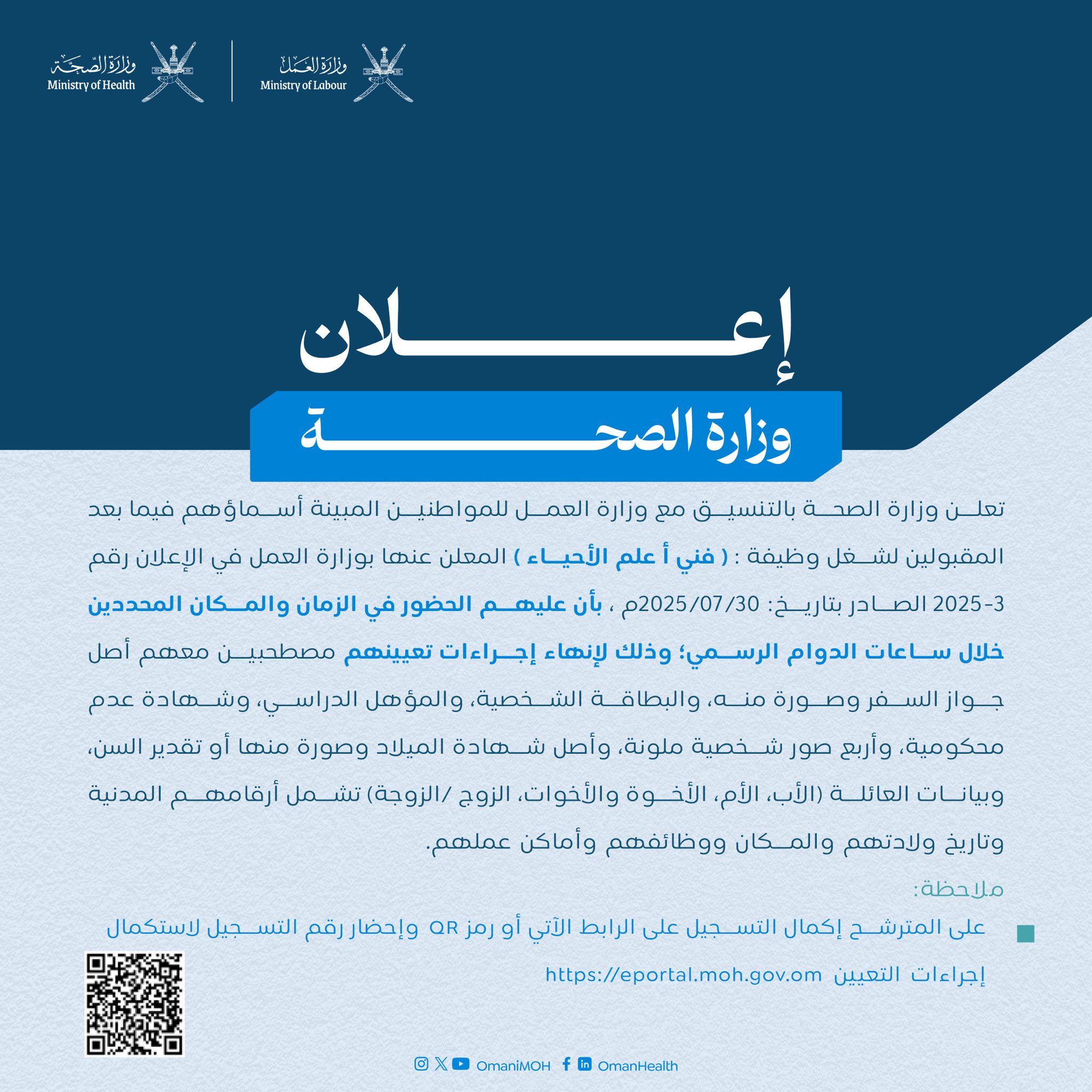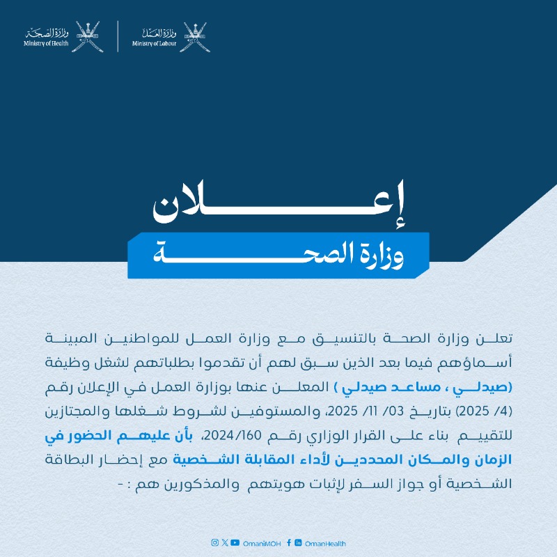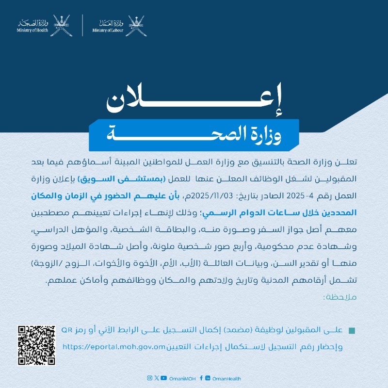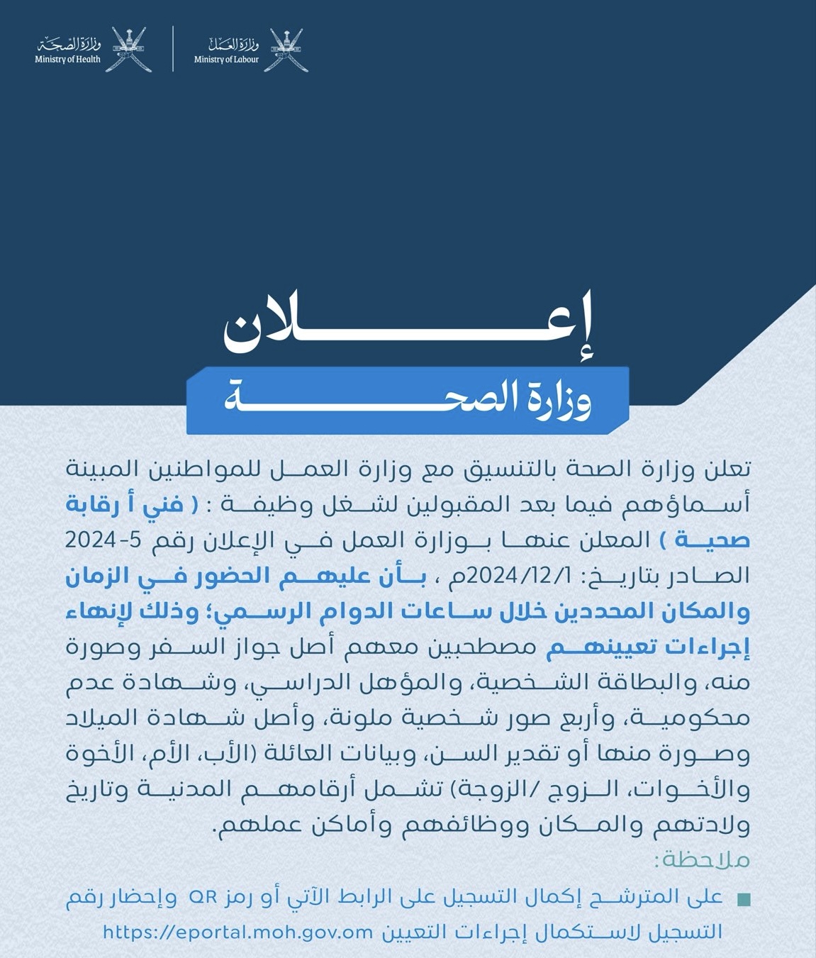 وزارة الصحة - أسماء المترشحين لاستكمال إجراءات التعيين لشغل وظيفة (مضمد) مستشفى خصب - المؤسسات الصحية بمحافظة مسندم