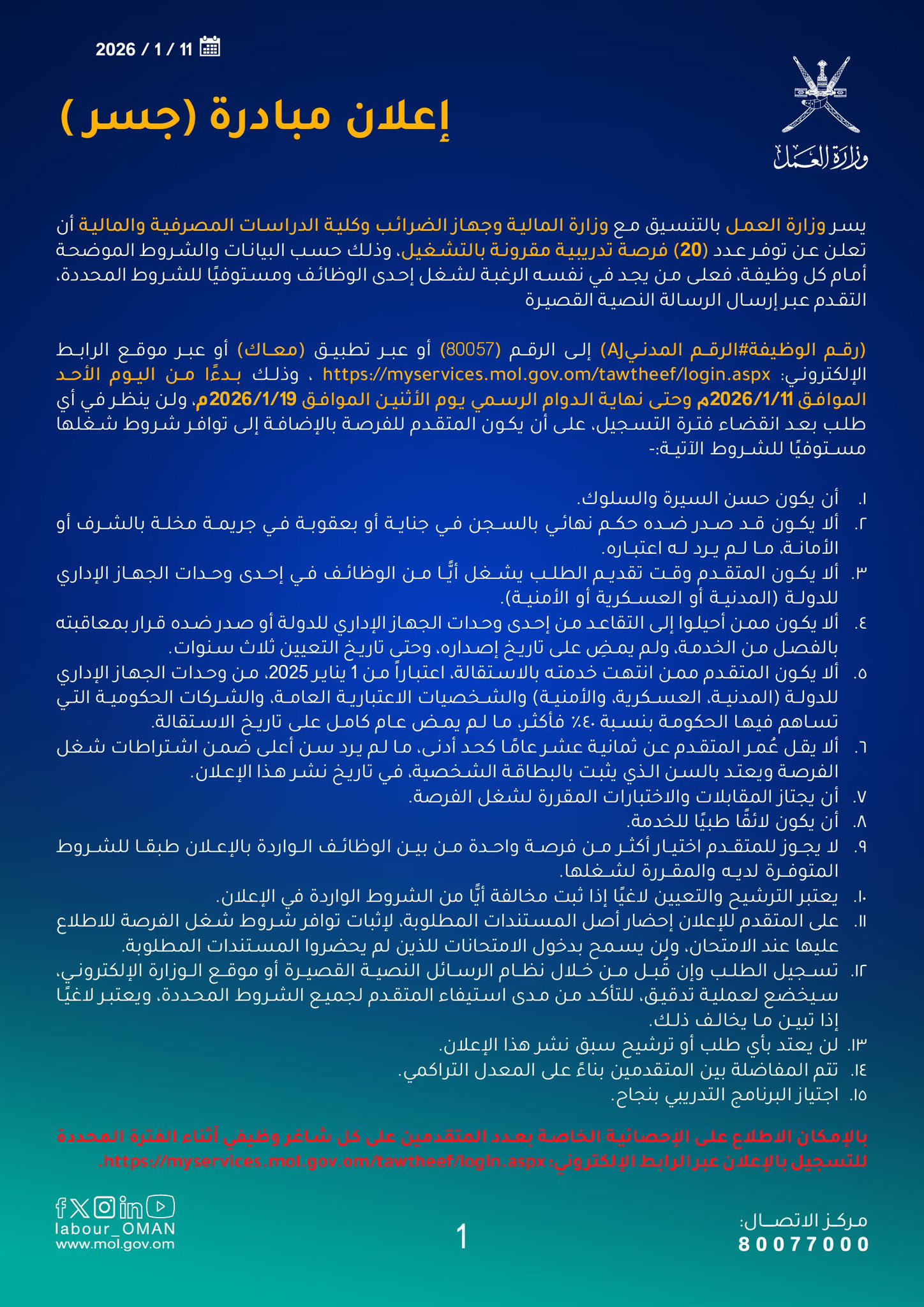 وزارة العمل بالتنسيق مع وزارة المالية وجهاز الضرائب وكلية الدراسات المصرفية والمالية - توفر 20 الفرص التدريبية مقرونة بالتشغيل وذلك ضمن مبادرة (جسر)
