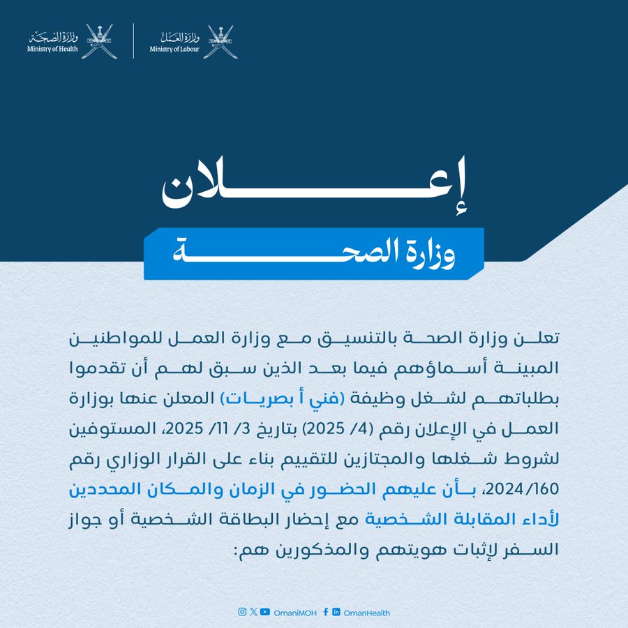 وزارة الصحة – أسماء المرشحين للاختبار التحريري والمقابلة الشخصية لوظيفة ( فني أ بصريات )