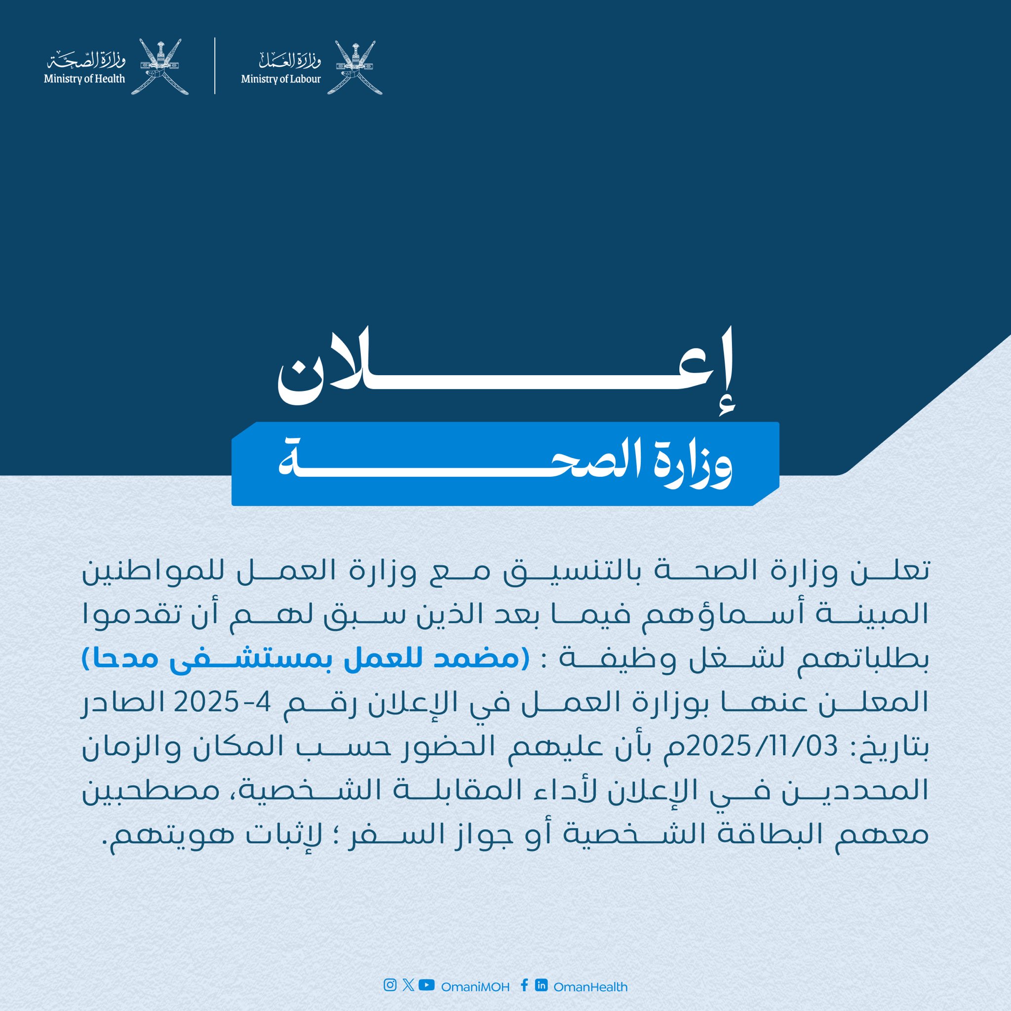 وزارة الصحة - أسماء مواطنين لأداء المقابلة الشخصية لشغل وظيفة ( مضمد ) ( مستشفى مدحا )