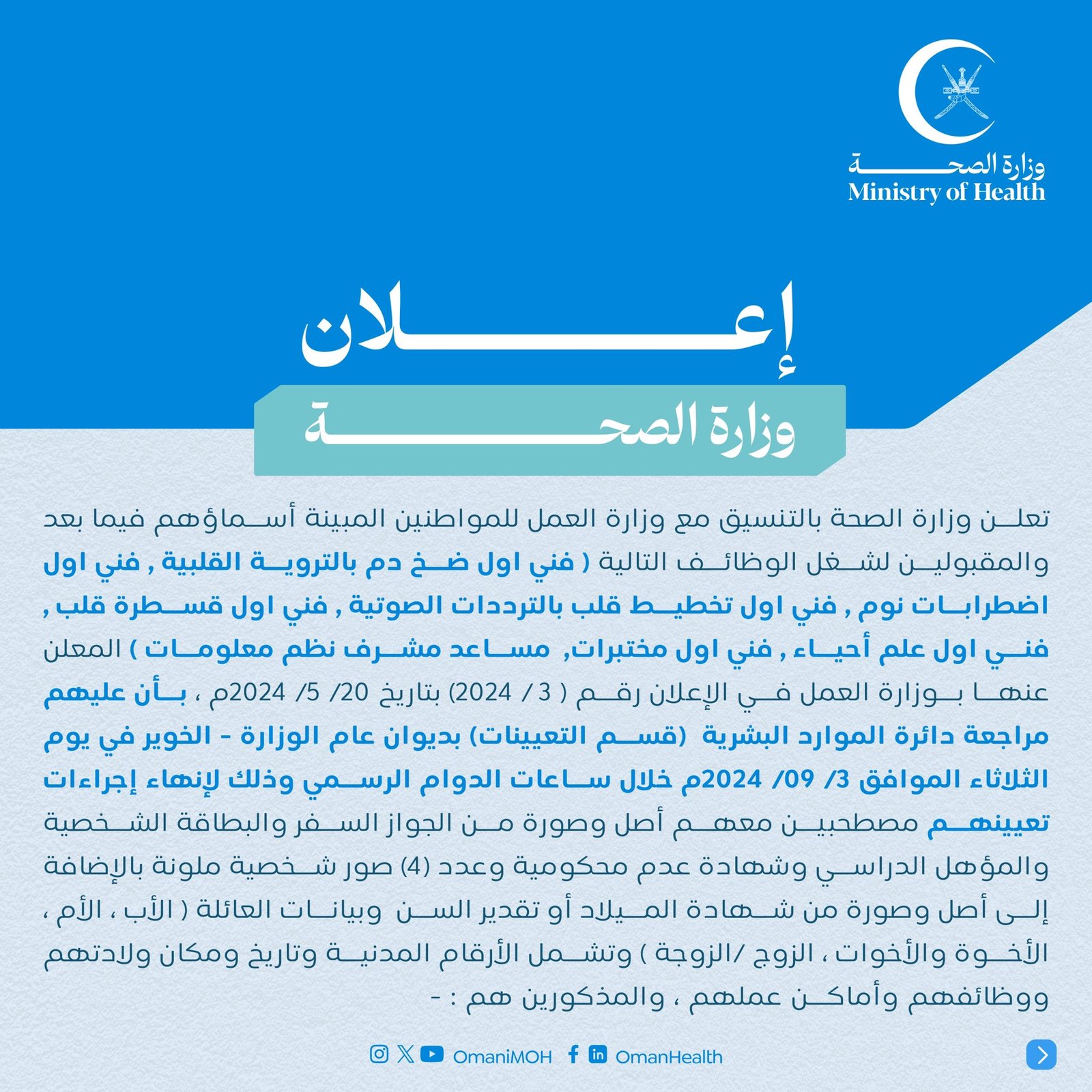 وزارة الصحة - أسماء مواطنين لإنهاء اجراءات تعيينهم لشغل وظيفة (مضمد)
