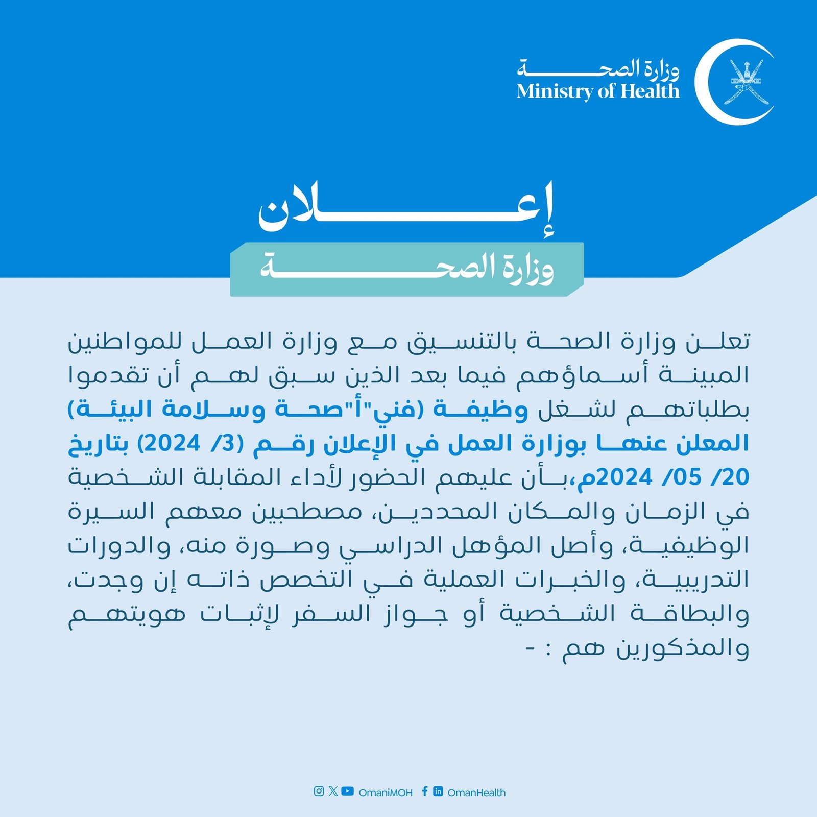 وزارة الصحة - اسماء مواطنين لإجراء المقابلة الشخصية لشغل وظيفة (فني أ صحة وسلامة البيئة )