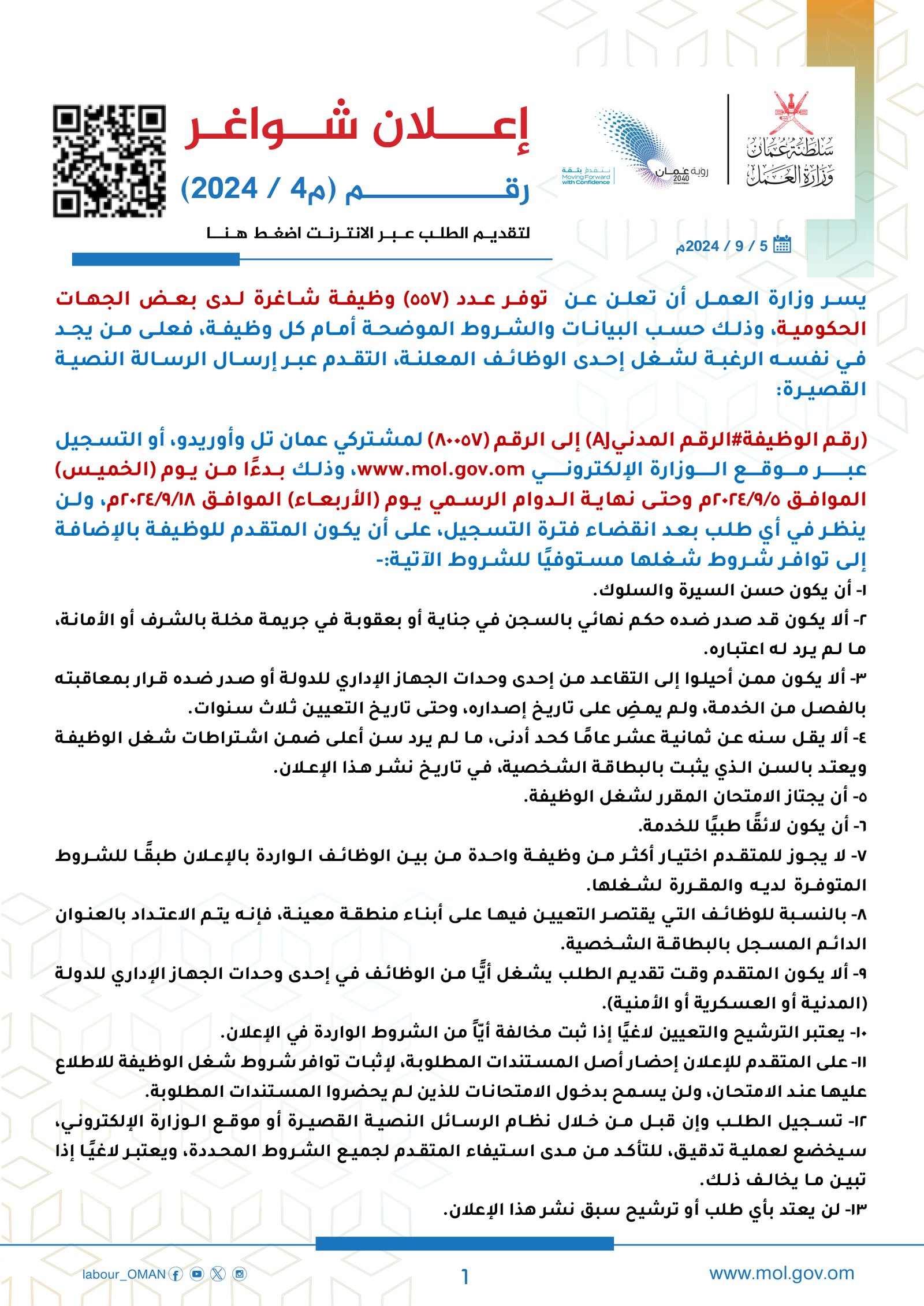 وزارة العمل - توفر (557) من الوظائف الشاغرة في عدد من الجهات الحكومية ( ملحق رقم 4 / 2024 )