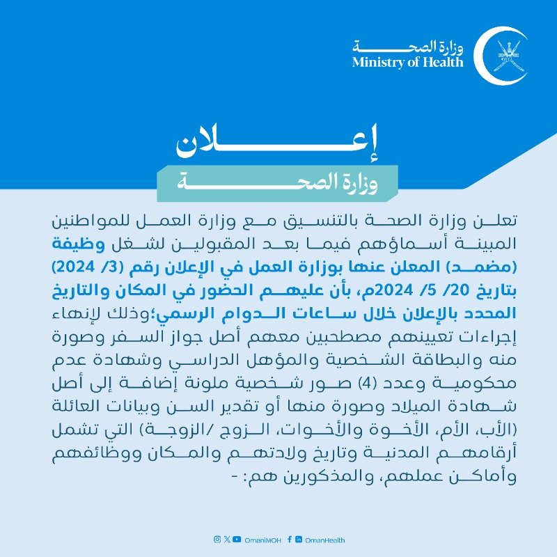 وزارة الصحة تُعلن للمواطنين المبينة أسماؤهم فيما بعد، بأن عليهم مراجعة دائرة الموارد البشرية بديوان عام الوزارة-الخوير