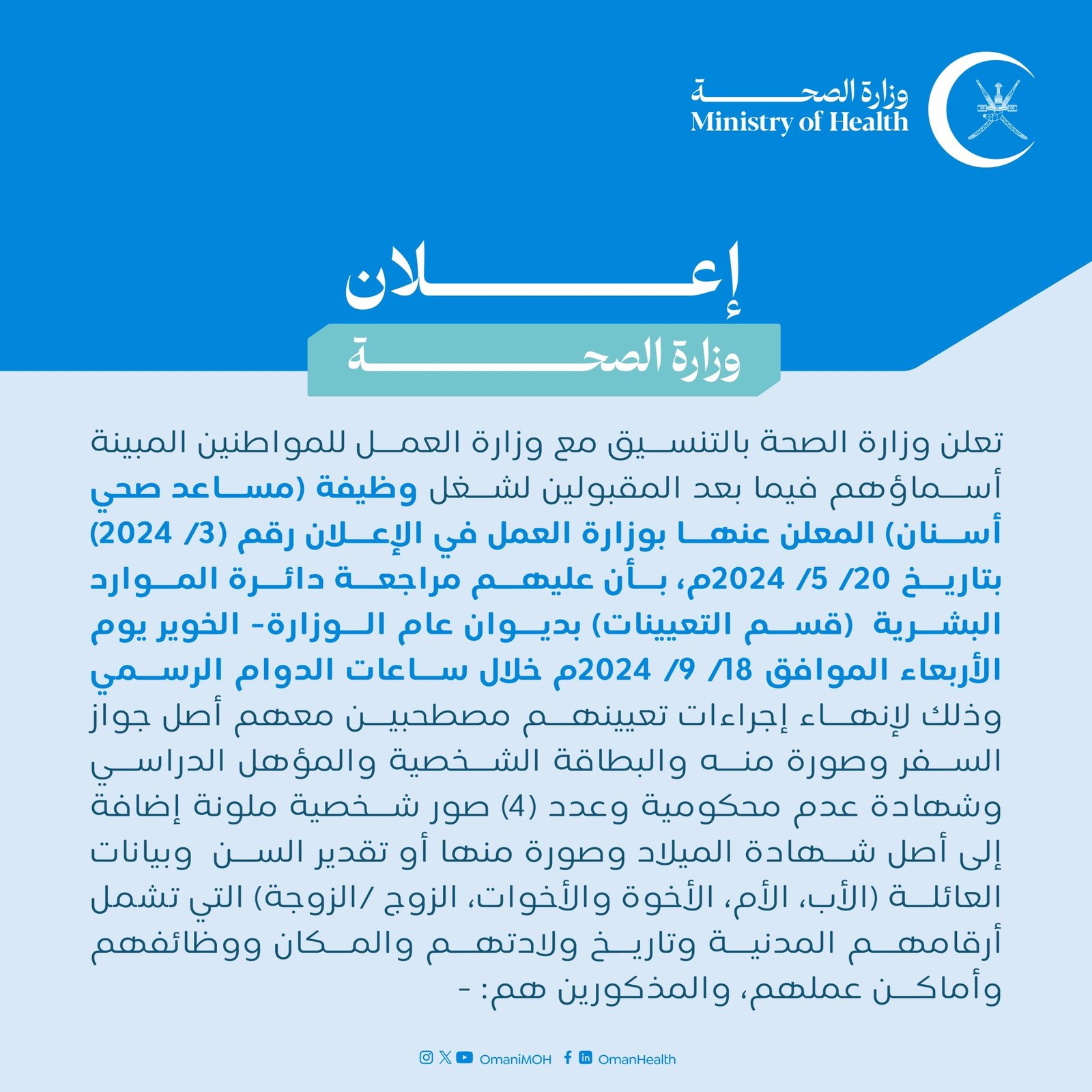 وزارة الصحة - أسماء مواطنين لإنهاء إجراءات تعيينهم لشغل وظيفة (مساعد صحي أسنان)