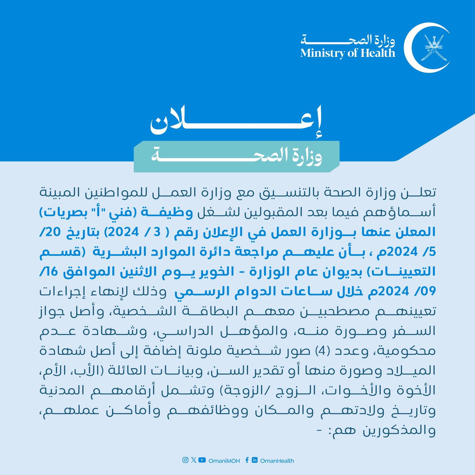وزارة الصحة - اسماء مواطنات لإنهاء إجراءات تعيينهن لشغل وظيفة (فني أ بصريات)