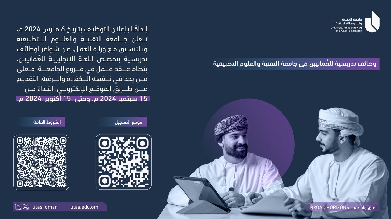 جامعة التقنية والعلوم التطبيقية - وظائف تدريسية تخصص اللغة الإنجليزية