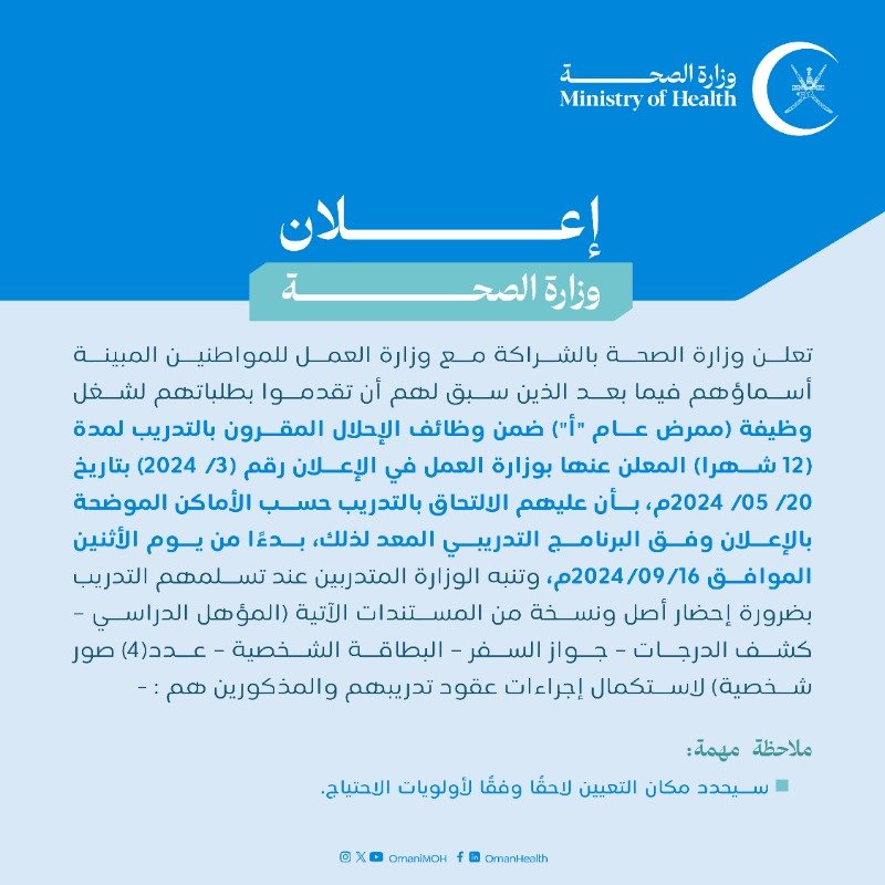 وزارة الصحة - أسماء مواطنين للالتحاق بالتدريب لشغل وظيفة (ممرض عام أ )