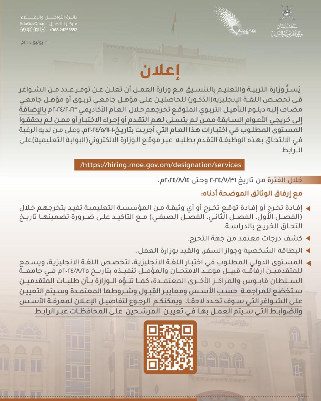 وزارة التربية والتعليم - توفر عدد من الشواغر في تخصص اللغة الإنجليزية (الذكور)