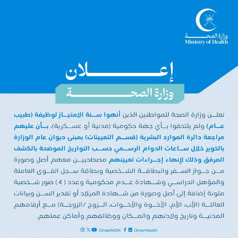 وزارة الصحة - أسماء مواطنين لإنهاء إجراءات تعيينهم لوظيفة (طبيب عام) ولم يلتحقوا بأي جهة حكومية (مدنية أو عسكرية)