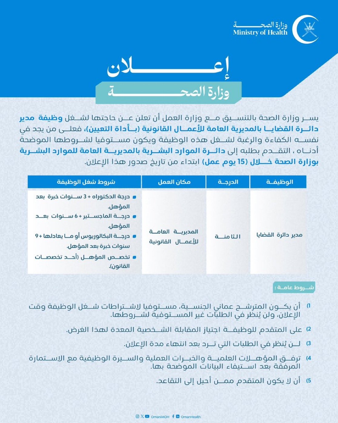 وزارة الصحة - وظيفة شاغرة ( مدير دائرة القضايا )