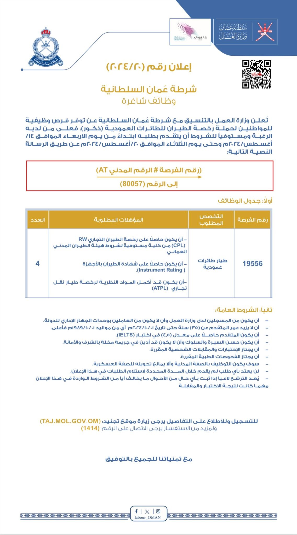 شرطة عُمان السلطانية - توفر فرص وظيفية للمواطنين من حملة رخصة الطيران العمودية (ذكور)