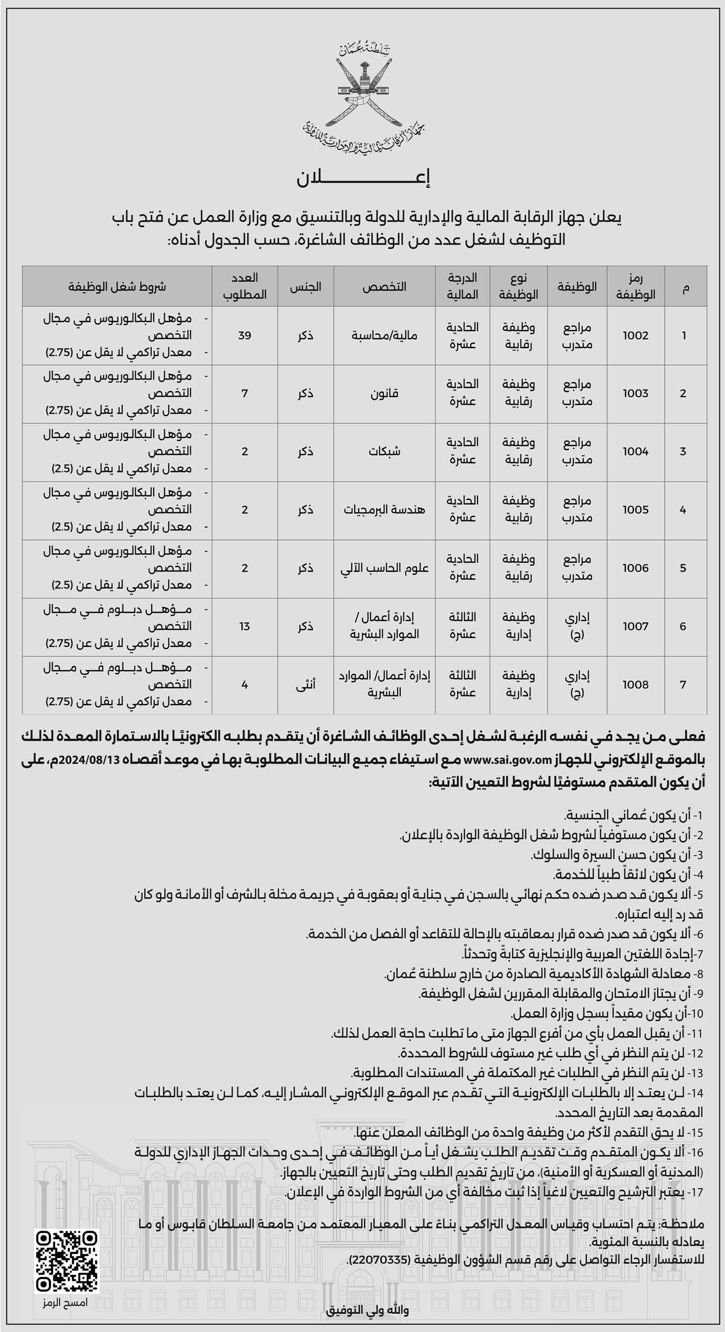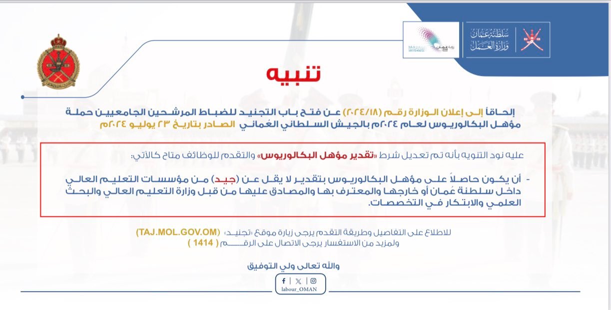 وزارة العمل - تنبيه بتعديل شروط تقدير مؤهل البكالوريوس في إعلان تجنيد بالجيش السلطاني العُماني الصادر بتاريخ 23 يوليو الجاري