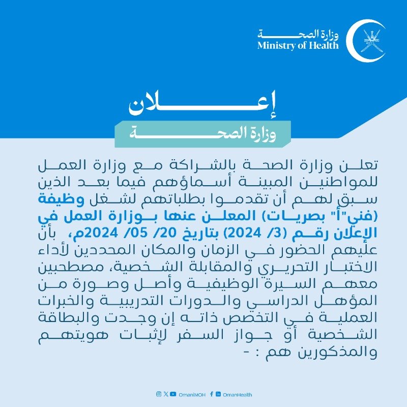وزارة الصحة - أسماء مواطنين لأداء المقابلة الشخصية لشغل وظيفة (مساعد صحي أسنان) بمحافظة ظفار