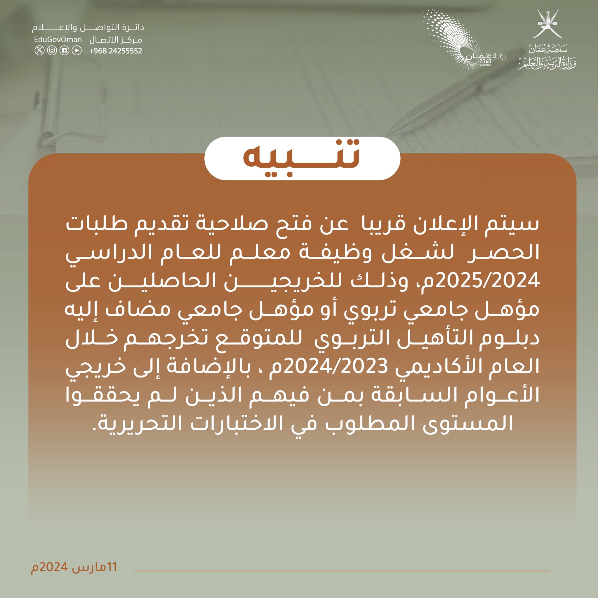 وزارة التربية والتعليم - سيتم الإعلان قريبا عن فتح صلاحية تقديم طلبات الحصر لشغل وظيفة معلم للعام الدراسي 2024-2025 م