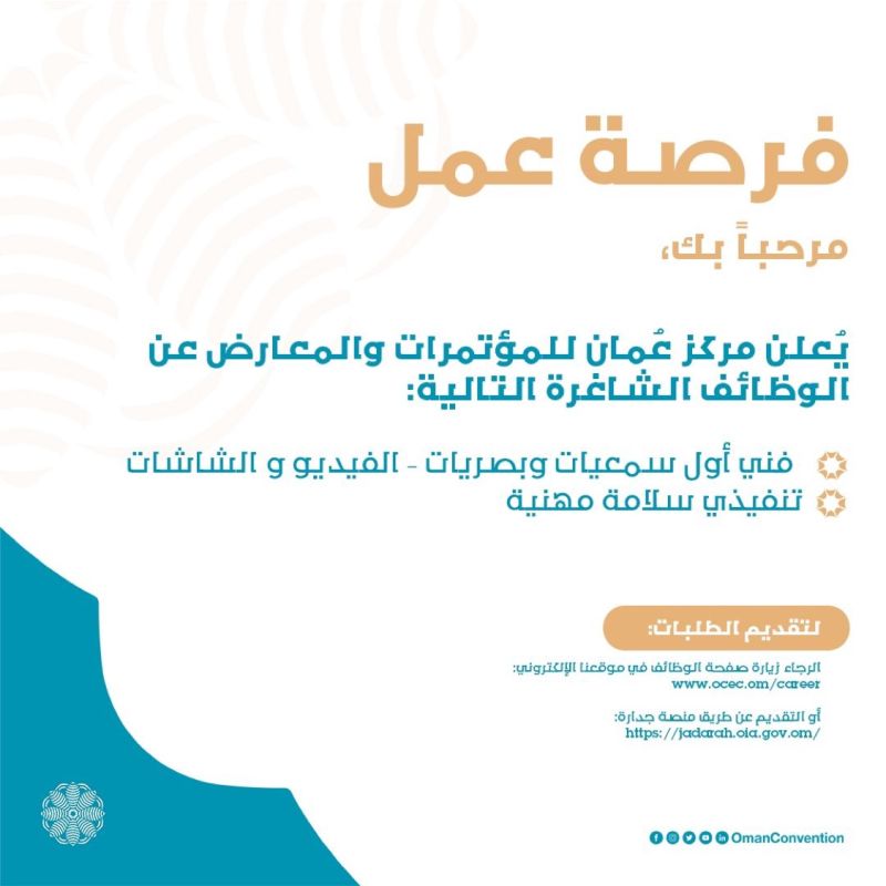 مركز عُمان للمؤتمرات والمعارض - فرصة وظيفية ( فني أول سمعيات وبصريات - الفيديو والشاشات + تنفيذي سلامة مهنية )