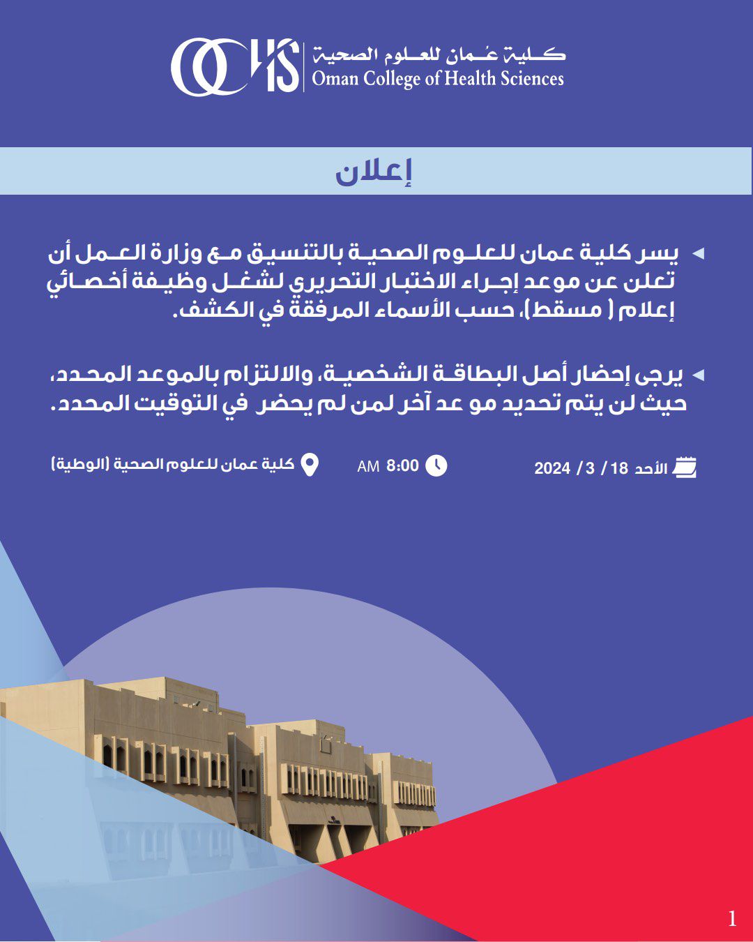 كلية عمان للعلوم الصحية بالتنسيق مع وزارة العمل أن تعلن عن موعد إجراء الاختبار التحريري لشغل وظيفة أخصائي إعلام ( مسقط )