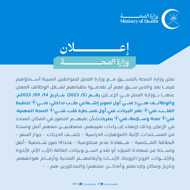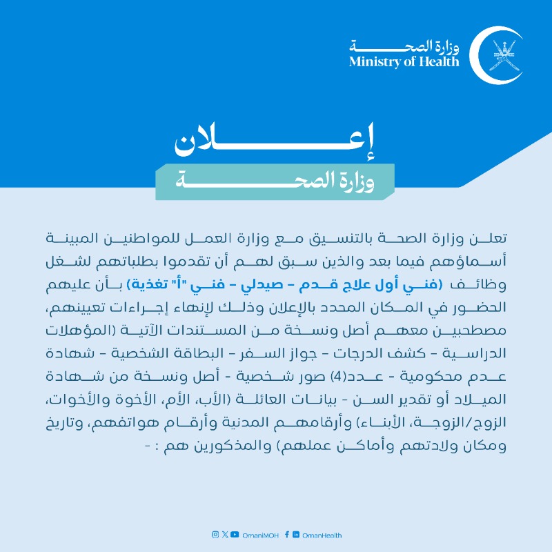وزارة الصحة - اسماء مواطنين لإنهاء إجراءات تعيينهم لشغل الوظائف (فني أول علاج قدم-صيدلي-فني"أ"تغذية)