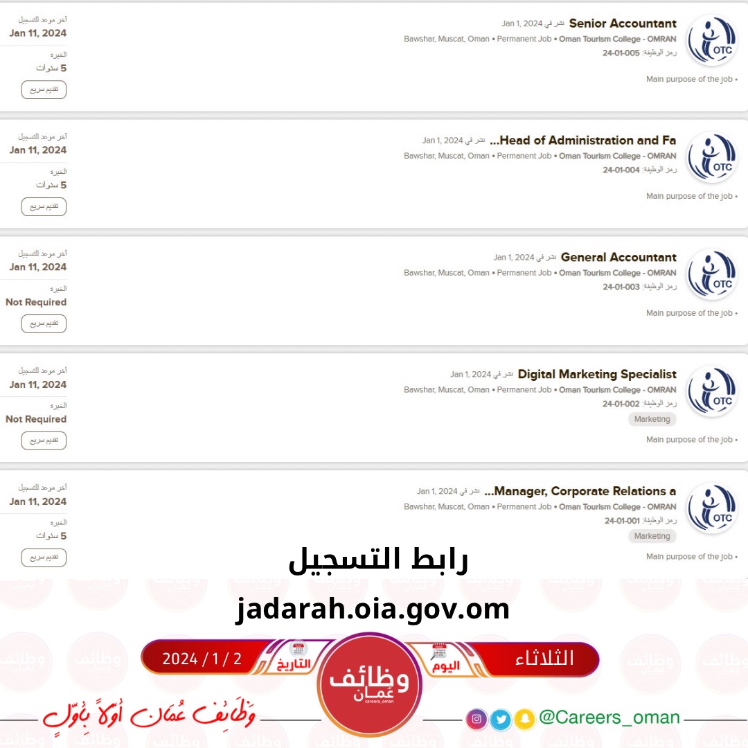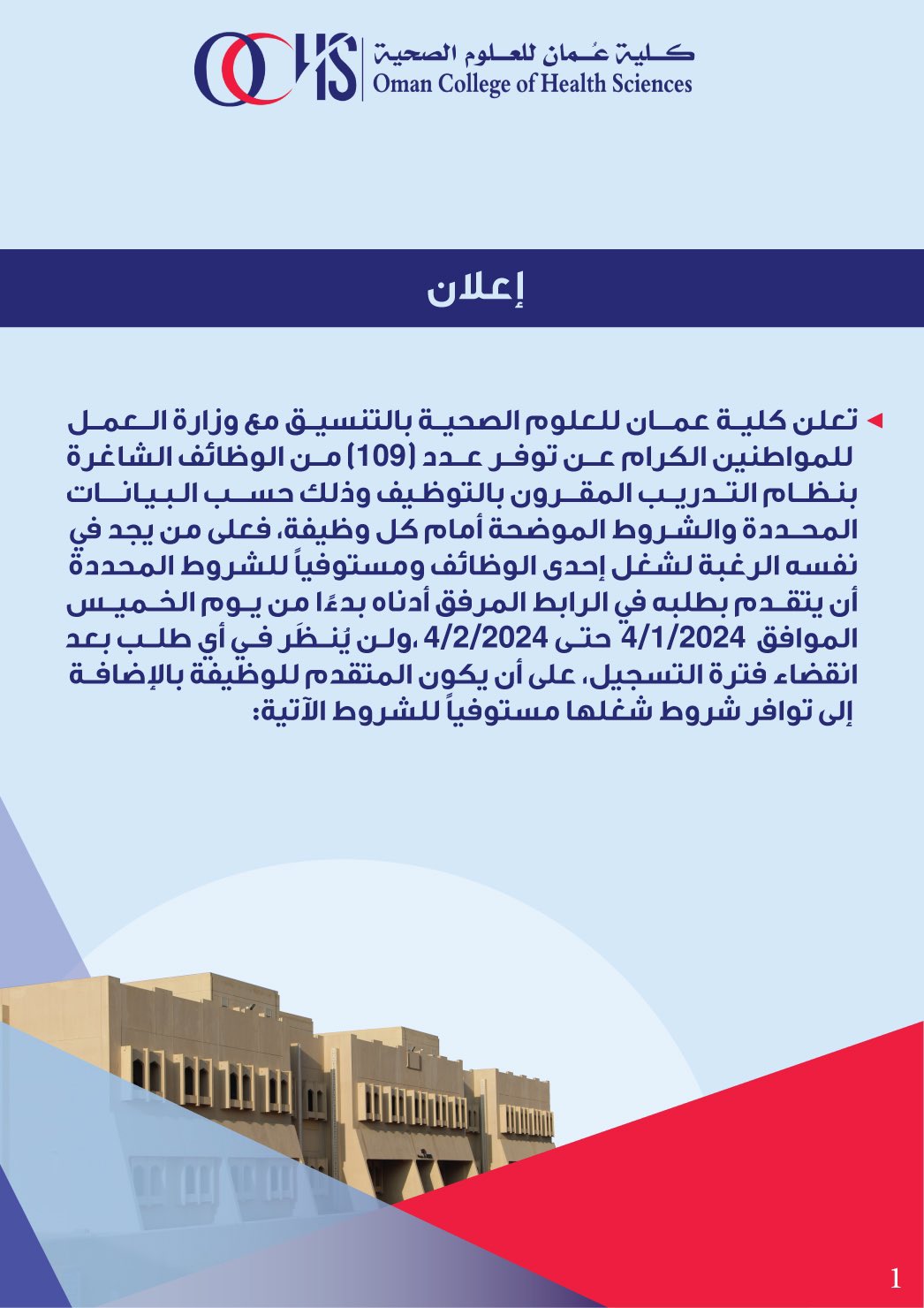 كلية عُمان للعلوم الصحية بالتنسيق مع وزارة العمل للمواطنين الكرام عن توفر عدد (109) من الوظائف الشاغرة بنظام التدريب ا