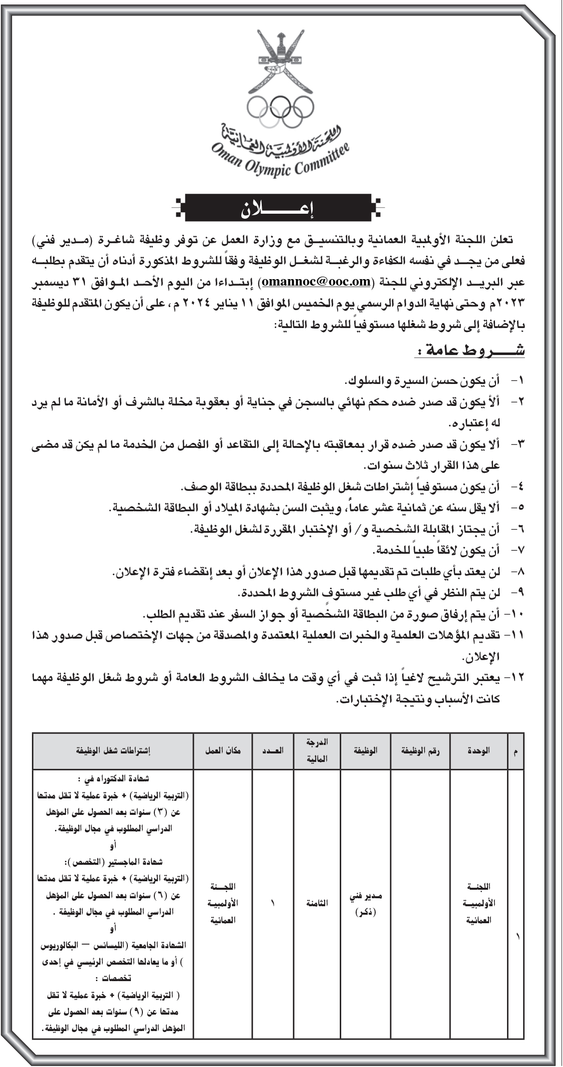 اللجنة الأولمبية العمانية - وظيفة شاغرة ( مدير فني )