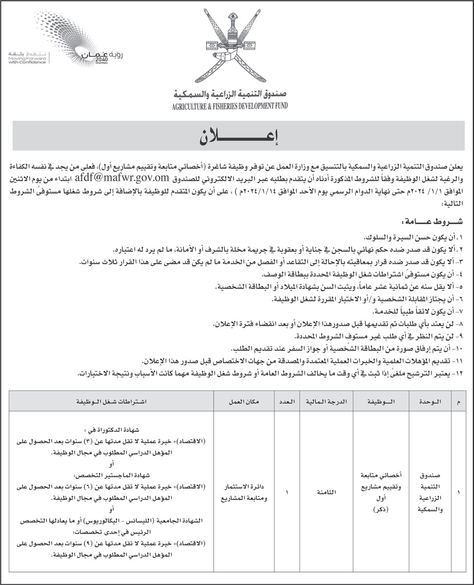 صندوق التنمية الزراعية والسمكية - وظيفة شاغرة ( أخصائي متابعة وتقييم مشاريع أول )