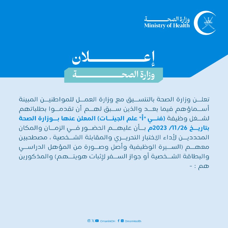 وزارة الصحة - اسماء مواطنين لاداء الاختبار التحريري لشغل وظيفة (فني "أ" علم الجينات)