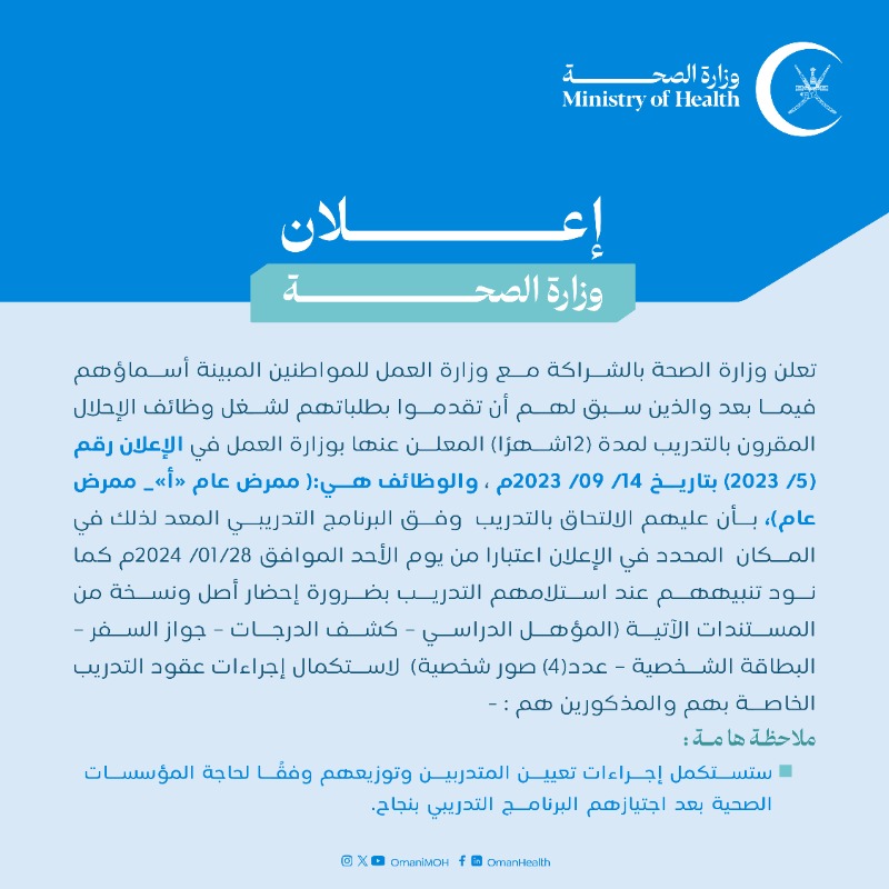 وزارة الصحة - أسماء مواطنين لاستكمال اجراءات عقود التدريب لشغل الوظائف (ممرض عام "أ" ، ممرض عام)