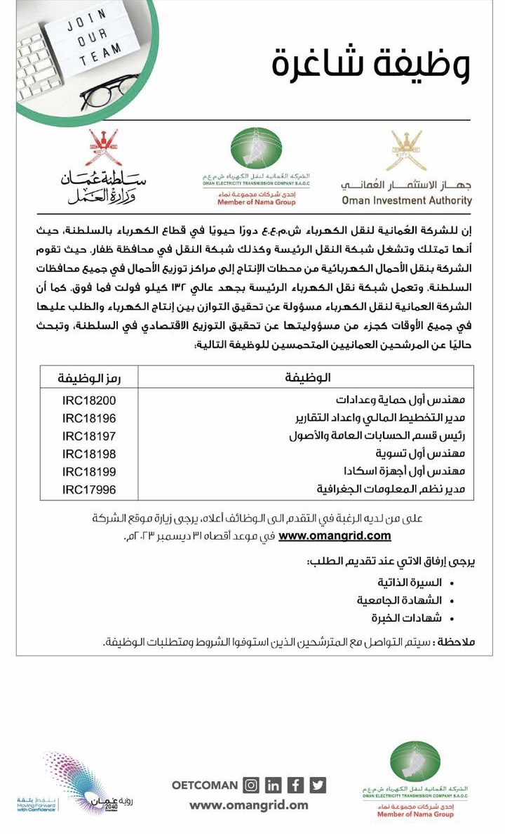 الشركة العمانية لنقل الكهرباء - 6 وظائف شاغرة