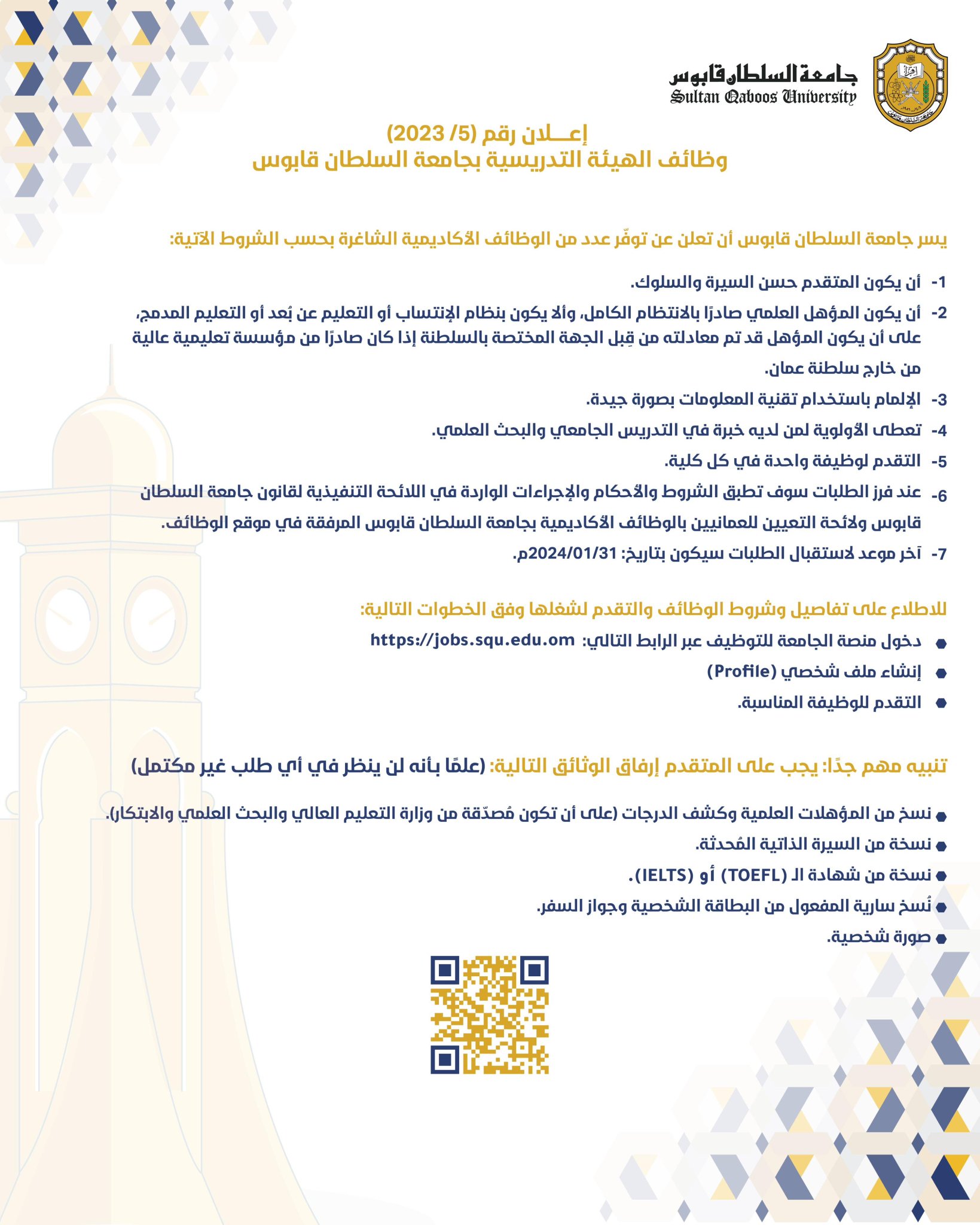 جامعة السلطان قابوس - توفر عدد من الوظائف الأكاديمية الشاغرة