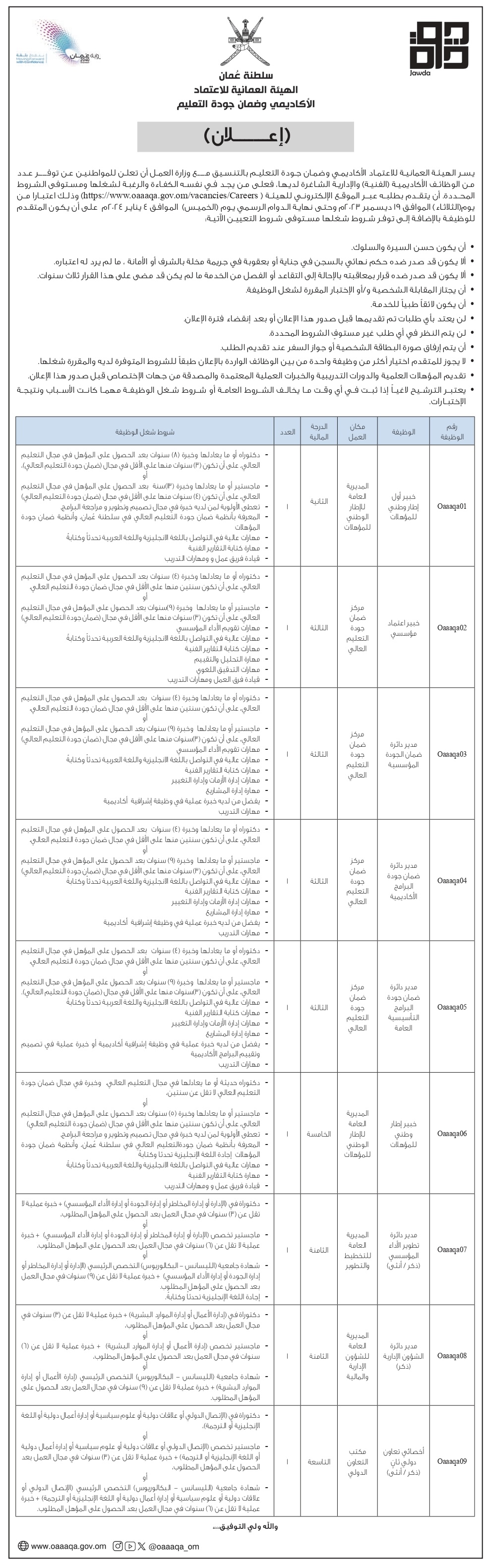 الهيئة العمانية للإعتماد الأكاديمي وضمان جودة التعليم - وظائف شاغرة